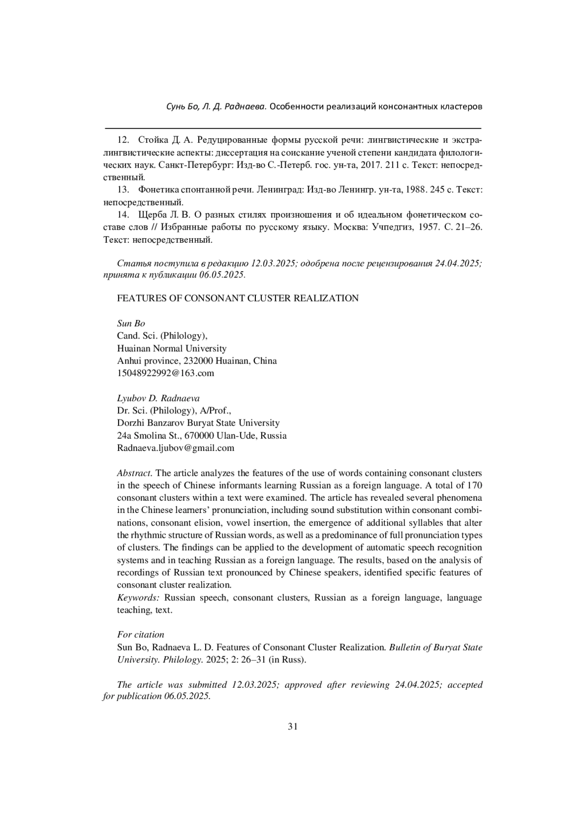 8. Раднаева Л. Д., Сунь Бо. Модификация фонем в русской речи китайцев. Теоретические и прикладные аспекты. Санкт-Петербург: Наукоемкие технологии, 2024. 176 с. Текст: непосредственный. EDN: MBGZAS