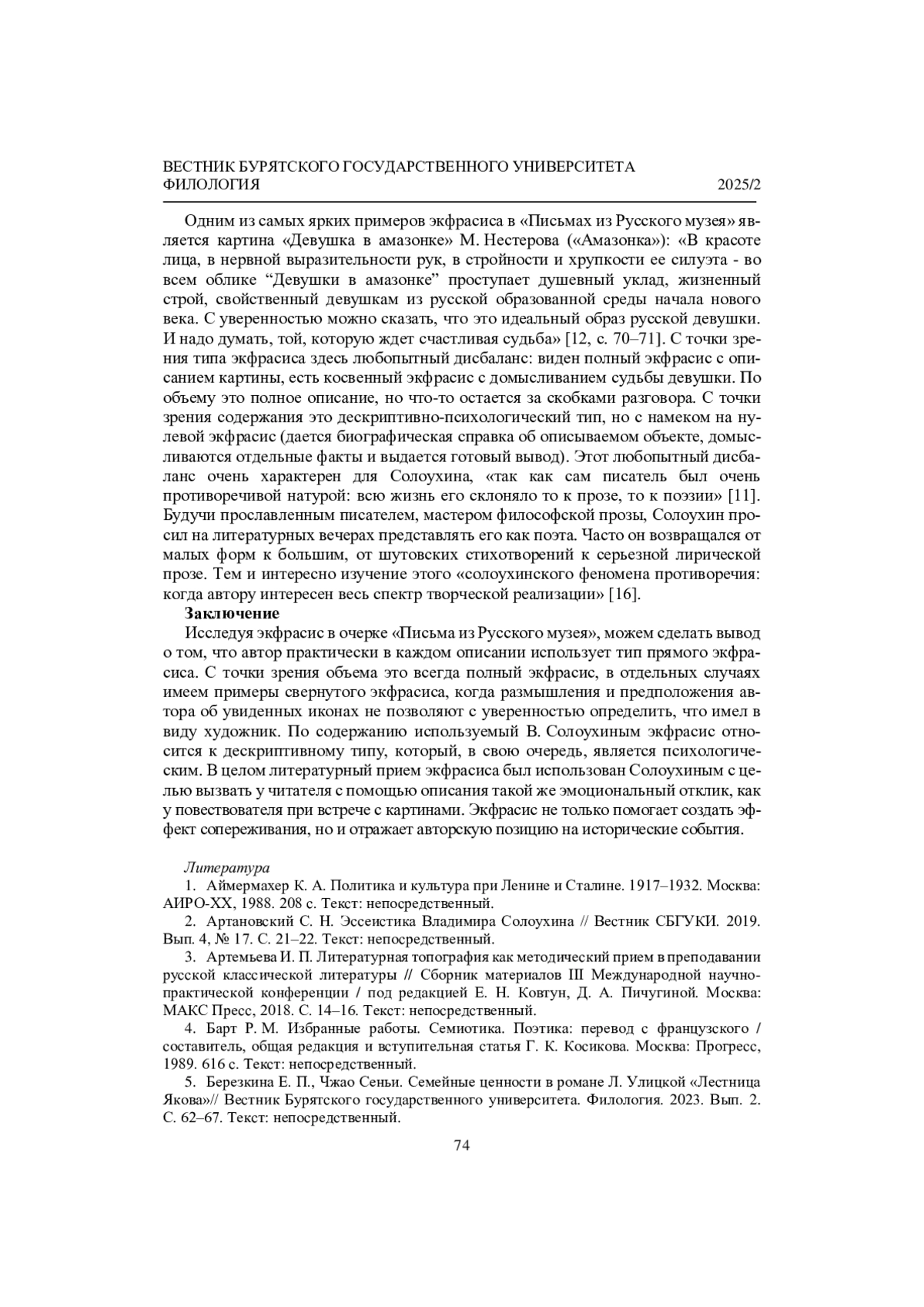 2. Артановский С. Н. Эссеистика Владимира Солоухина // Вестник СБГУКИ. 2019. Вып. 4, № 17. С. 21-22. Текст: непосредственный.