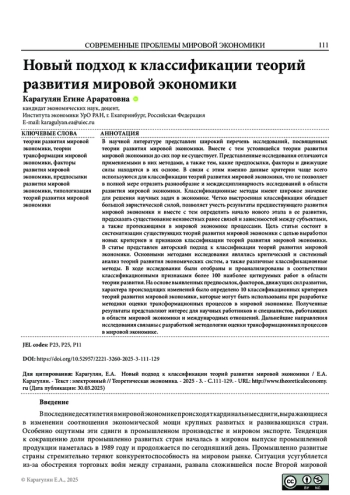 Аннотация. В научной литературе представлен широкий перечень исследований, посвященных теории развития мировой экономики. Вместе с тем устоявшейся теории развития мировой экономики до сих пор не существует. Представленные исследования отличаются применяемыми в них методами, а также тем, какие предпосылки, факторы и движущие силы находятся в их основе. В связи с этим именно данные критерии чаще всего используются для классификации теорий развития мировой экономики, что не позволяет в полной мере отразить разнообразие и междисциплинарность исследований в области развития мировой экономики. Классификационные методы имеют широкое значение для решения научных задач в экономике. Четко выстроенная классификация обладает большой эвристической силой, позволяет учесть результаты предшествующего развития мировой экономики и вместе с тем определить начало нового этапа в ее развитии, предсказать существование неизвестных ранее связей и зависимостей между субъектами, а также протекающими в мировой экономике процессами. Цель статьи состоит в систематизации существующих теорий развития мировой экономики с целью выработки новых критериев и признаков классификации теорий развития мировой экономики. В статье представлен авторский подход к классификации теорий развития мировой экономики. Основными методами исследования являлись критический и системный анализ теорий развития экономических систем, а также различные классификационные методы. В ходе исследования были отобраны и проанализированы в соответствии классификационными признаками более 100 наиболее цитируемых работ в области теории развития. На основе выявленных предпосылок, факторов, движущих сил развития, характера происходящих изменений было определено 10 классификационных критериев теорий развития мировой экономики, которые могут быть использованы при разработке методики оценки трансформационных процессов в мировой экономике. Полученные результаты представляют интерес для научных работников и специалистов, работающих в области мировой экономики и международных отношений. Дальнейшие направления исследования связаны с разработкой методологии оценки трансформационных процессов в мировой экономике.
