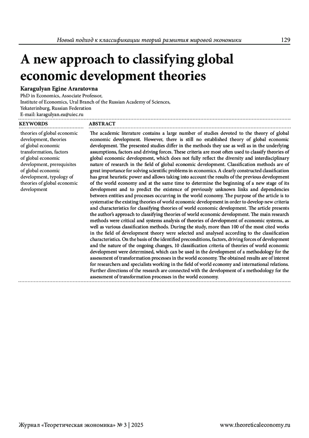 25. Карагулян Е. А. Факторы и принципы трансформации мировой экономики / Е. А. Карагулян // Экономические отношения. - 2024. - Т. 14, № 4. - С. 677-700. DOI: 10.18334/eo.14.4.122381 EDN: SKKWNE