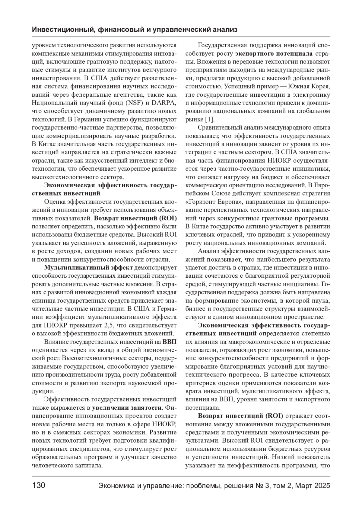 Государственные инвестиции в инновационные технологии являются важным инструментом стимулирования экономического роста и технологического развития. В данной статье рассматривается влияние государственного финансирования на эффективность инновационной деятельности, анализируются ключевые механизмы поддержки и их экономическая результативность. Особое внимание уделено оценке возврата инвестиций, влиянию на развитие высокотехнологичных отраслей и созданию конкурентных преимуществ на глобальном рынке. Выявлены основные барьеры и риски, ограничивающие эффективность государственных вложений, а также предложены рекомендации по повышению результативности инновационной политики.