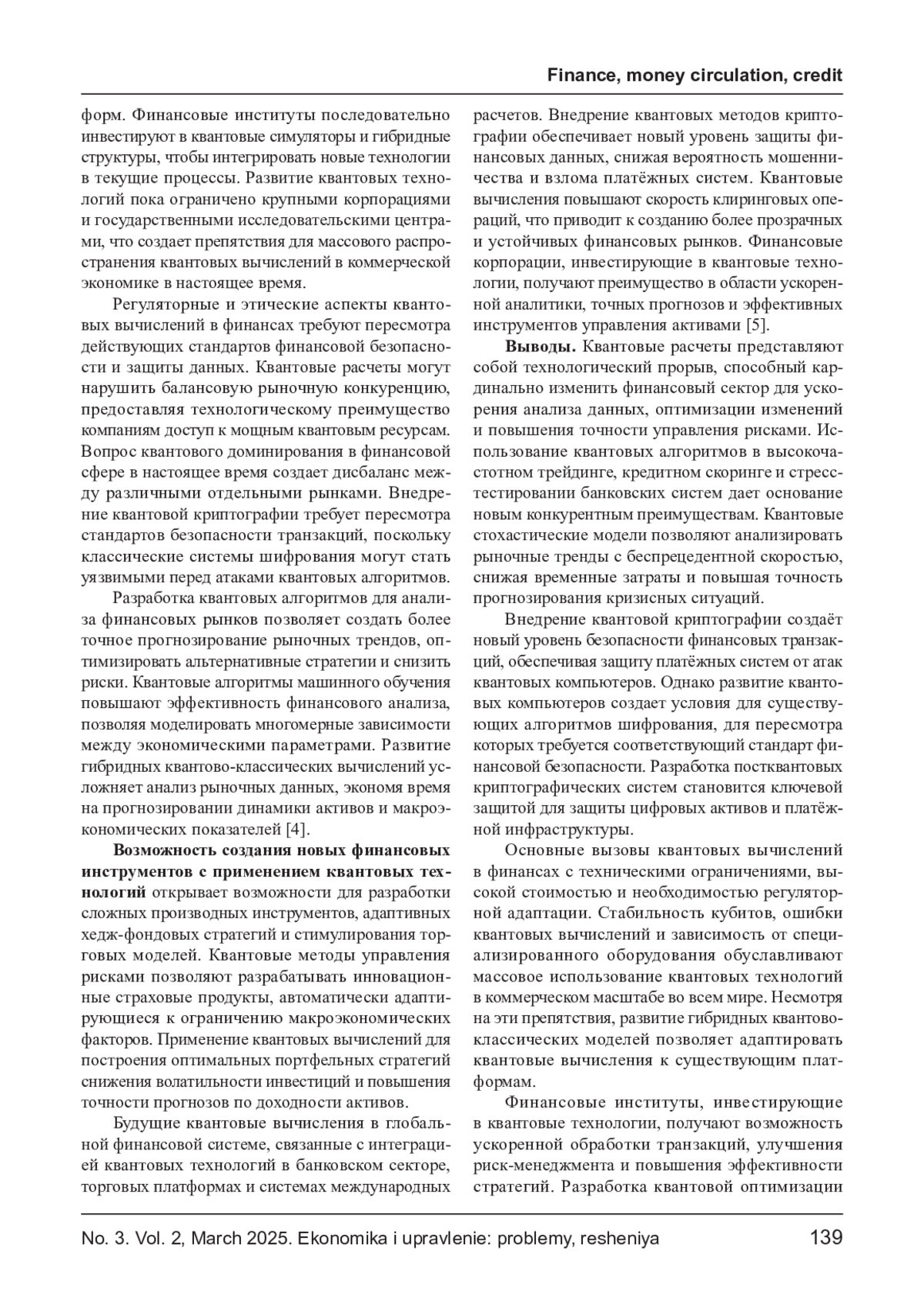 Развитие квантовых связей открывает новые возможности для финансовых рынков, способствует ускоренной обработке данных, оптимизации стратегий и повышению эффективности управления рисками. Квантовые алгоритмы, обладая экспоненциальной вычислительной мощностью, способны решать задачи, имеющиеся для классических компьютеров, что делает их перспективными для высокочастотного трейдинга, стресс- тестирования банковских систем и анализа ликвидности. Внедрение квантовой криптографии и оптимизационных алгоритмов меняет подход к безопасности финансовых операций и прогнозированию динамики активов. В статье рассматриваются основные направления использования квантовых компьютеров в финансах, анализируются их последствия, потенциальные угрозы и регуляторные вызовы. Особое внимание уделяется влиянию квантовой революции на финансовый сектор экономики и возможности ее перехода к новым технологиям.