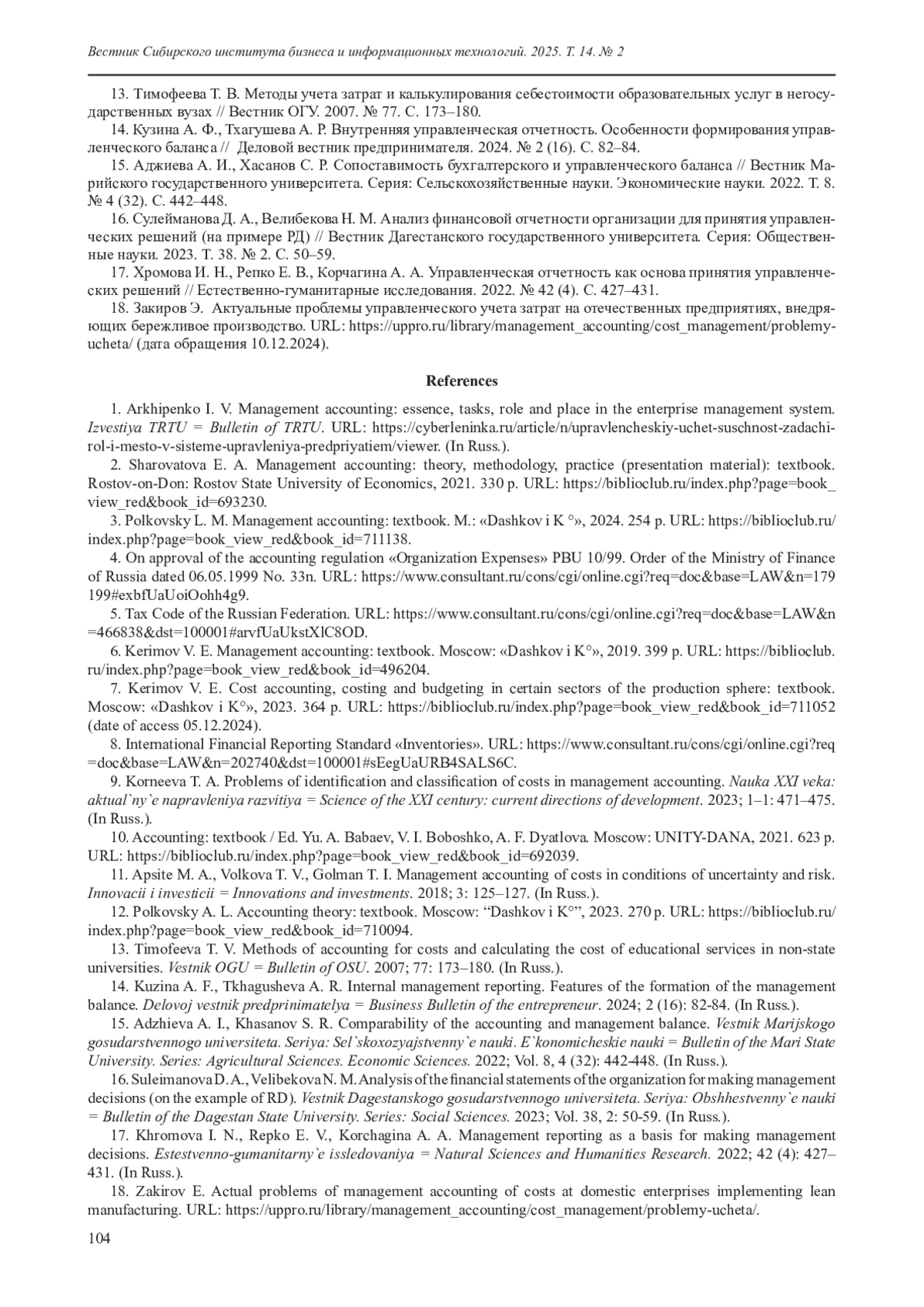 1. Архипенко И. В. Управленческий учет: сущность, задачи, роль и место в системе управления предприятием // Известия ТРТУ. URL: https://cyberleninka.ru/article/n/upravlencheskiy-uchet-suschnost-zadachi-rol-i-mesto-v-sisteme-upravleniya-predpriyatiem/viewer (дата обращения 01.12.2024).