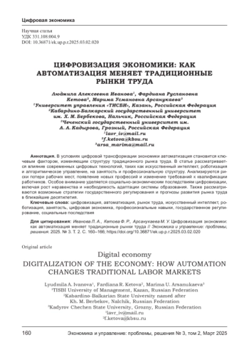 В условиях цифровой трансформации экономики автоматизация становится ключевым фактором, изменяющим структуру традиционного рынка труда. В статье рассматривается влияние современных цифровых технологий, таких как искусственный интеллект, роботизация и алгоритмическое управление, на занятость и профессиональную структуру. Анализируются риски потери рабочих мест, появление новых профессий и изменение требований к квалификации работников. Особое внимание уделяется социально- экономическим последствиям цифровизации, включая рост неравенства и необходимость адаптации системы образования. Также рассматриваются возможные стратегии государственного регулирования и прогнозы развития рынка труда в ближайшие десятилетия.