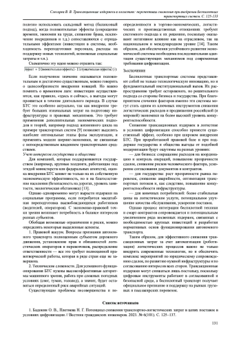 1. Бадокин О. В., Плетнева Н. Г. Потенциал снижения транспортно-логистических затрат в цепях поставок в условиях цифровизации // Вестник гражданских инженеров. 2023. № 6(101). С. 125-137.