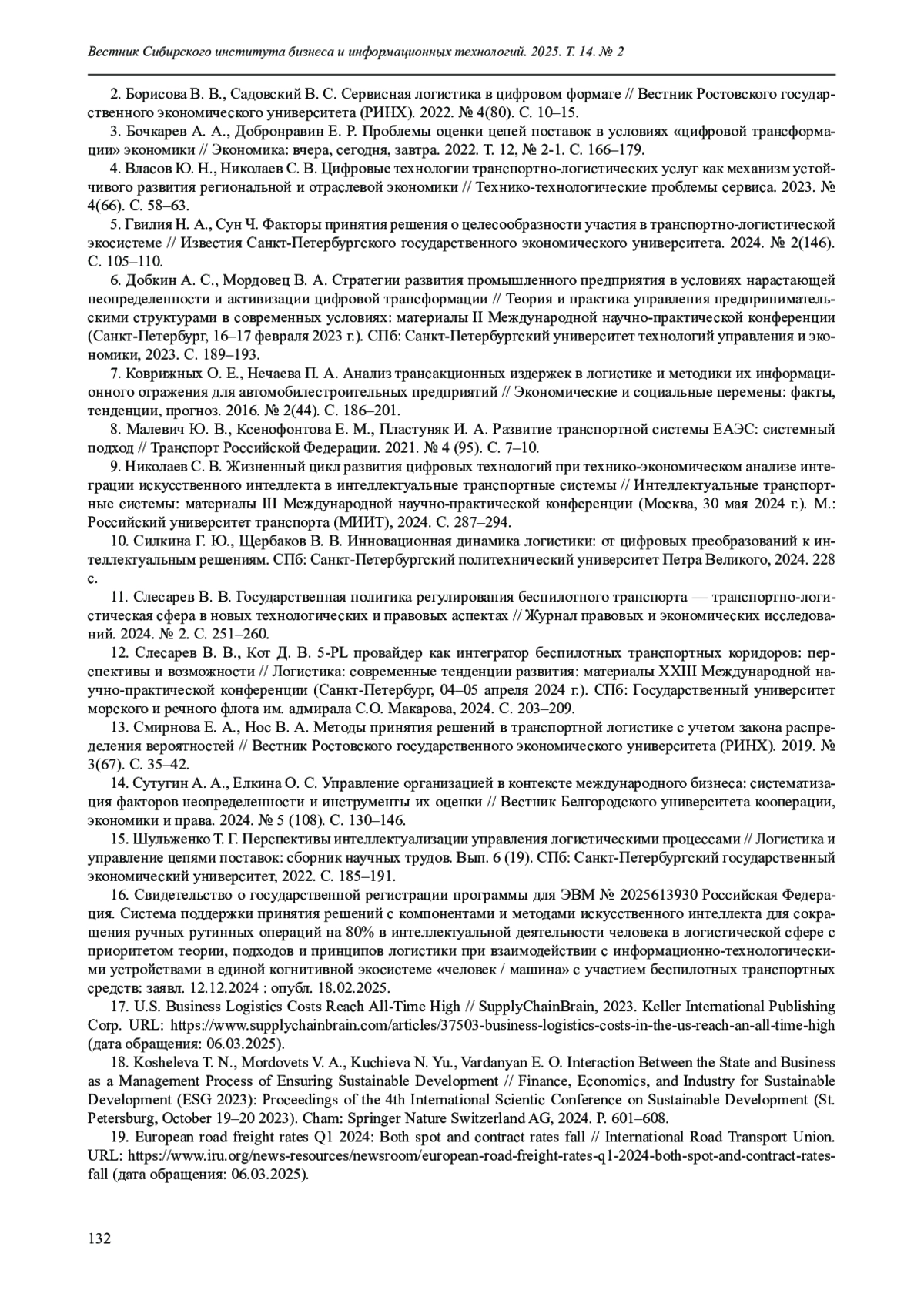 2. Борисова В. В., Садовский В. С. Сервисная логистика в цифровом формате // Вестник Ростовского государственного экономического университета (РИНХ). 2022. № 4(80). С. 10-15.