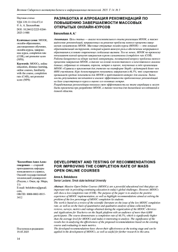 9. Li Sh., Zhao Yu., Guo L., Ren M., Li J., Zhang L., Li K. Quantification and prediction of engagement: Applied to personalized course recommendation to reduce dropout in MOOCs // Information Processing and Management. 2024. № 61(1). С. 103536. https://doi.org/10.1016/j.ipm.2023.103536.