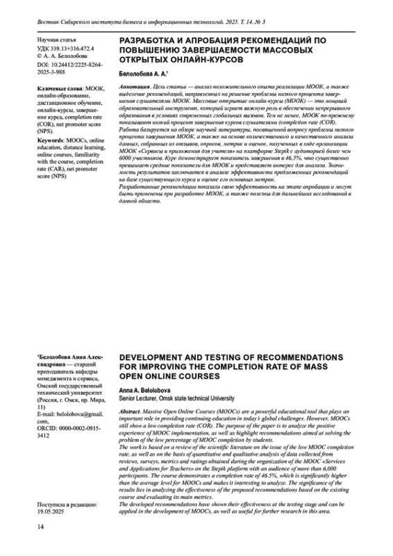 Разработанные рекомендации показали свою эффективность на этапе апробации и могут быть применены при разработке МООК, а также полезны для дальнейших исследований в данной области.
