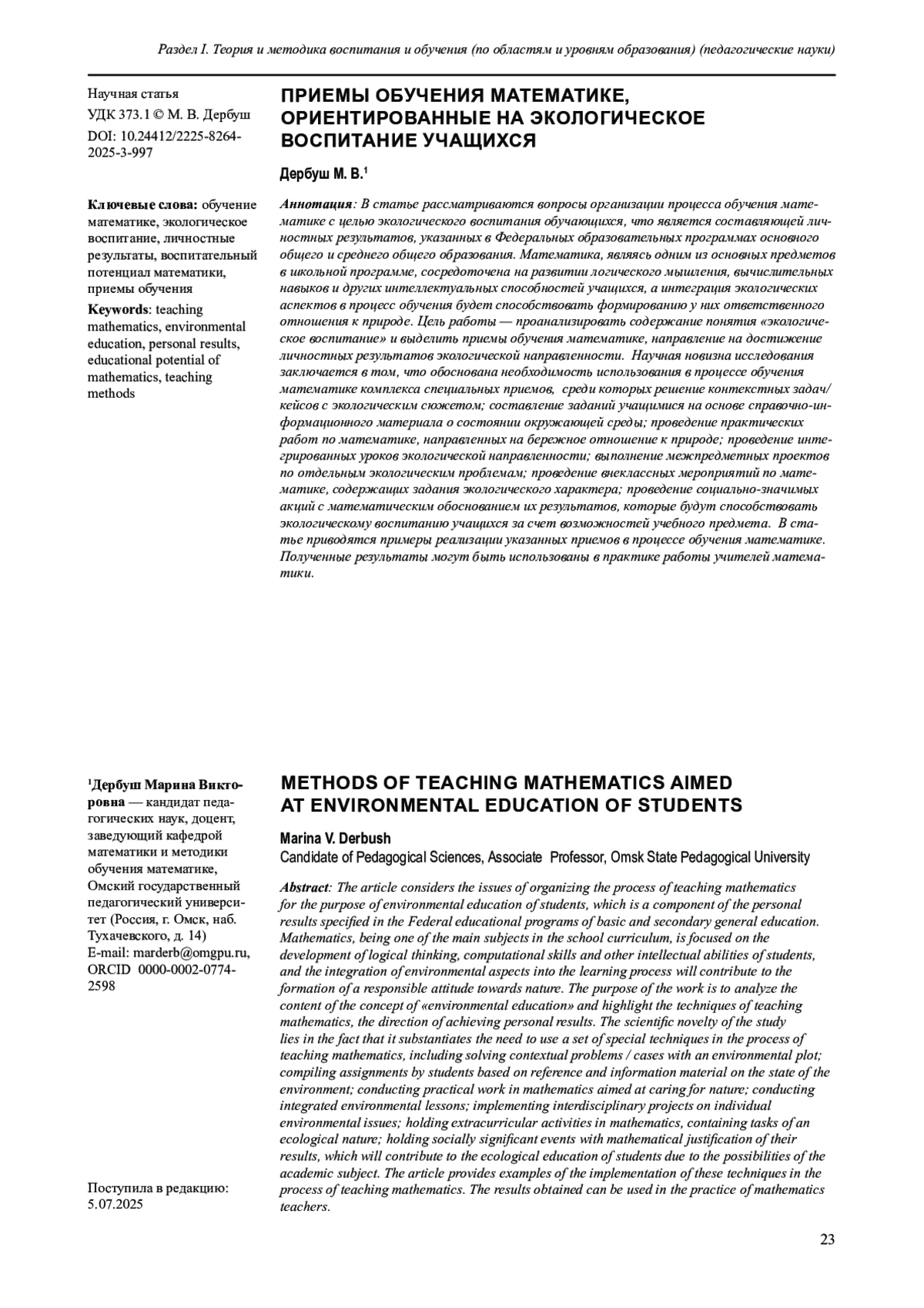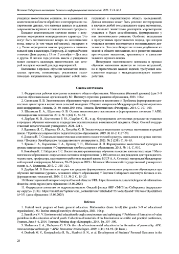 6. Дюкина Н. Г. Социально-экологическая компонента экологической культуры школьников на уроках математики // Вестник Оренбургского государственного университета. 2023. № 2 (238). С. 56-63.