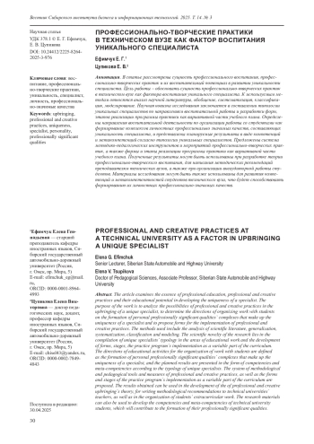 В статье рассмотрены сущность профессионального воспитания, профессионально-творческих практик и их воспитательный потенциал в развитии уникальности специалиста. Цель работы – обосновать сущность профессионально-творческих практик в техническом вузе как фактора воспитания уникального специалиста. К используемым методам относятся анализ научной литературы, обобщение, систематизация, классификация, моделирование. Научная новизна исследования заключается в составлении типологии уникальных специалистов по направлениям воспитательной работы и разработки форм, этапов реализации программы практики как вариативной части учебного плана. Определены направления воспитательной деятельности по организации работы со студентами как формирование комплексов личностных профессионально значимых качеств, составляющих уникальность специалиста, и представлены планируемые результаты в виде компетенций и метакомпетенций согласно типологии уникальных специалистов. Предложены система методико-педагогических инструментов и мероприятий профессионально-творческих практик, а также формы и этапы реализации программы практики как вариативной части учебного плана. Полученные результаты могут быть использованы при разработке теории профессионально-творческого воспитания, для написания методических рекомендаций преподавателям технических вузов, а также при организации внеаудиторной работы студентов. Материалы исследования могут быть также использованы для развития компетенций и метакомпетентностей студентов технического вуза, что будет способствовать формированию их личностных профессионально-значимых качеств.