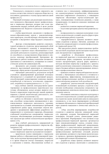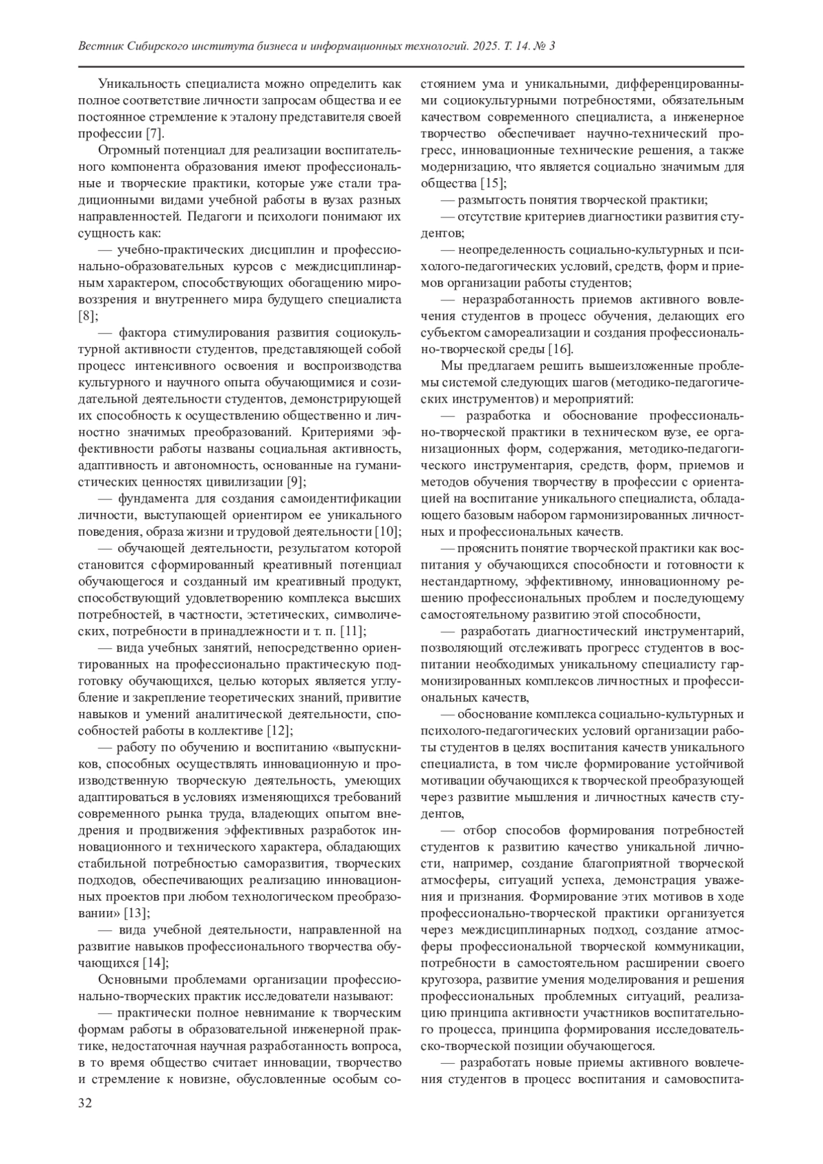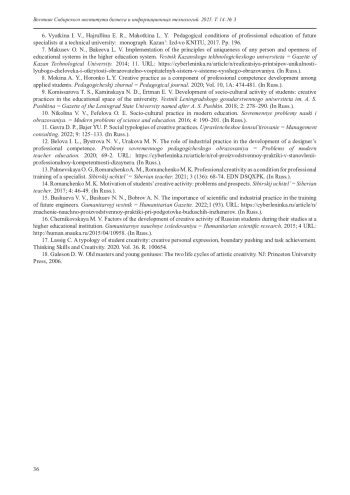 13. Пахневская О. Г., Романченко А. М., Романченко М. К. Профессиональное творчество как условие профессиональной подготовки специалиста // Сибирский учитель. 2021. № 3 (136). С. 68-74. EDN DSQXPK.