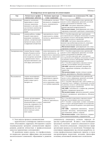 Соответственно предлагается пять содержательных блоков программы практики — рационализация, оптимизация, эксперимент, исследование и координация. В каждом из модулей рассматриваются такие аспекты, как профессиональный имидж, особенности поведения, формирование самоидентичности, в частности речевой имидж, контроль эмоций и эмпатия, учет интересов окружающих, стремление к компромиссу и успешному сотрудничеству, система убеждений и ценностных ориентаций и ее внедрение в деятельность, рефлексивность, самодисциплина и адекватность оценок.