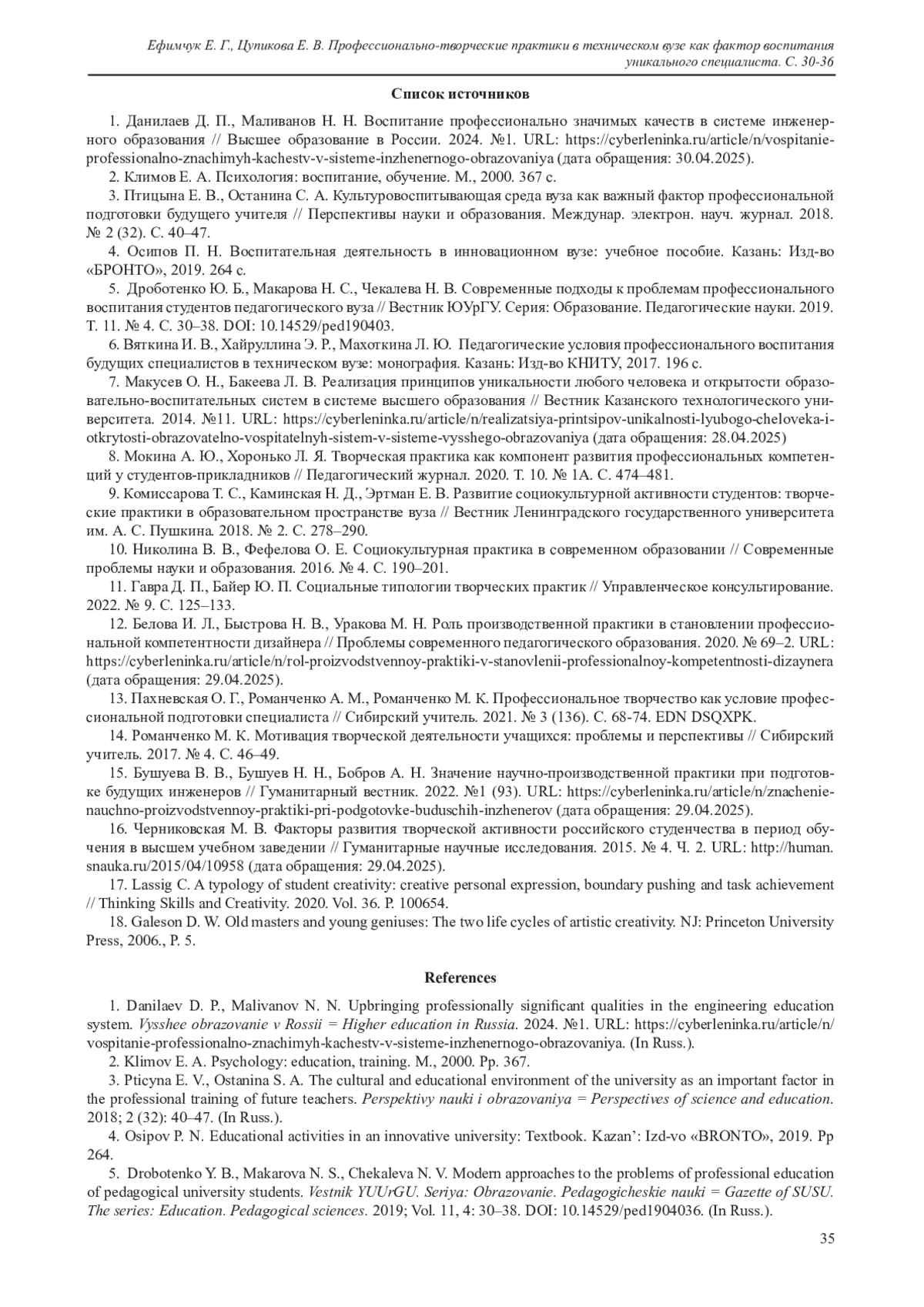 1. Данилаев Д. П., Маливанов Н. Н. Воспитание профессионально значимых качеств в системе инженерного образования // Высшее образование в России. 2024. №1. URL: https://cyberleninka.ru/article/n/vospitanie-professionalno-znachimyh-kachestv-v-sisteme-inzhenernogo-obrazovaniya (дата обращения: 30.04.2025).