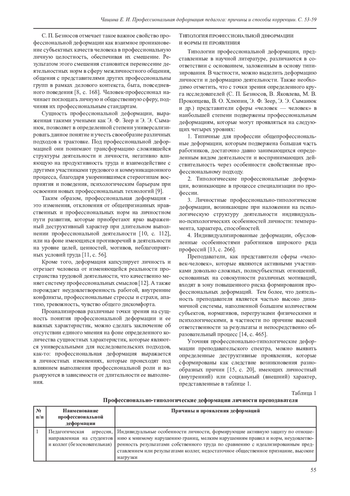 14. Захарова Е. В. Профессиональная педагогическая деятельность как фактор профессиональной деформации личности учителей и преподавателей // Известия Самарского научного центра РАН. Психология, педагогика. 2015. Т. 17. № 2 (2). С. 465-472.