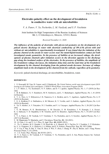Статья: Влияние полярности электродов на развитие пробоя в проводящей воде с микропузырьками воздуха (2020)