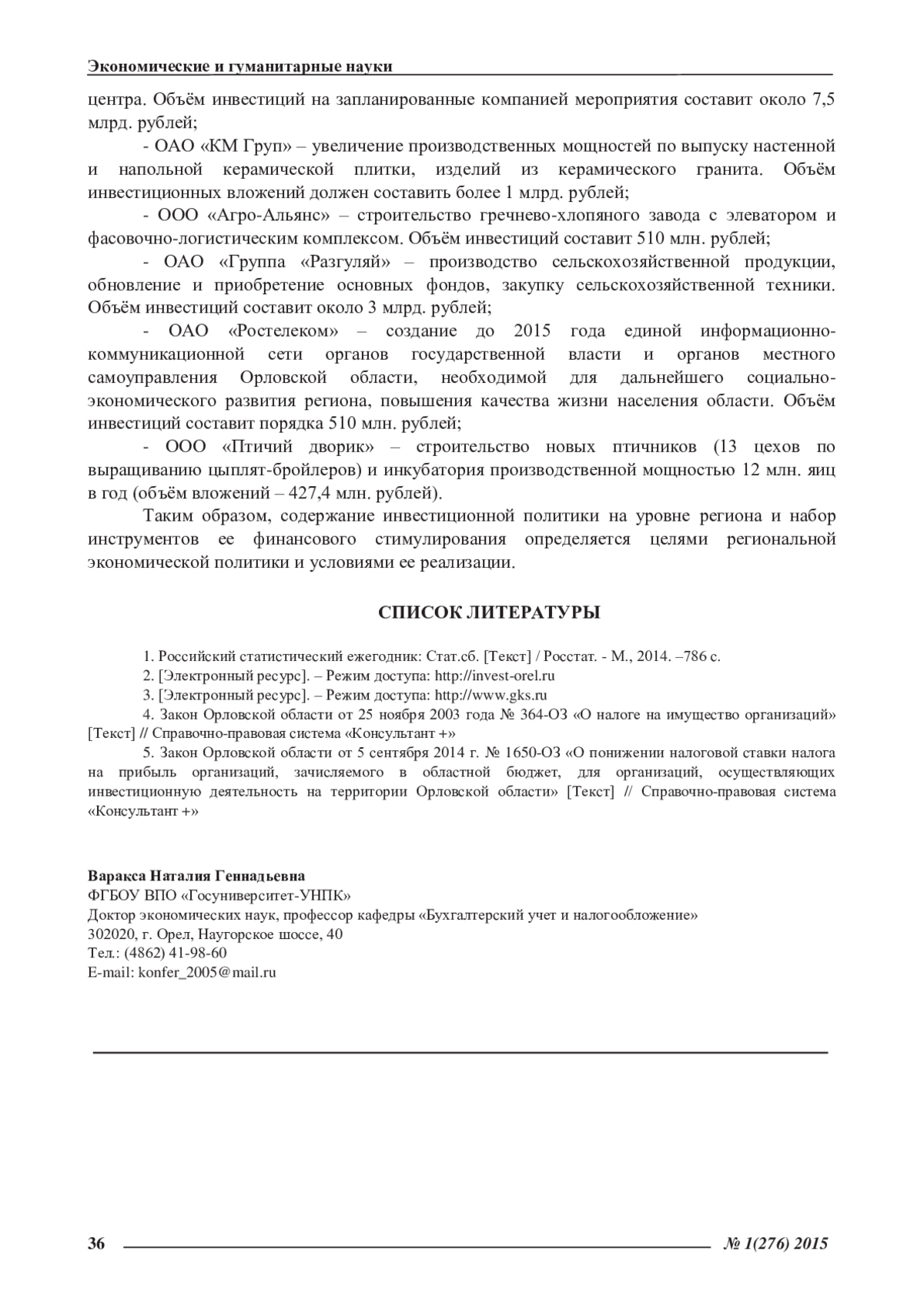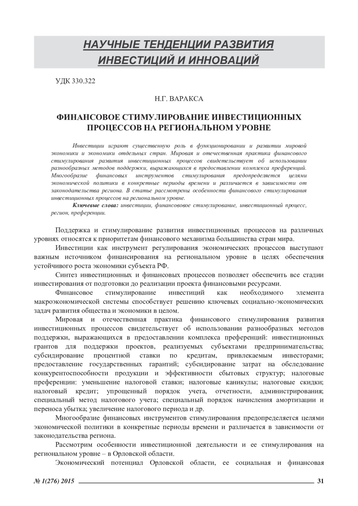 ВАРАКСА Н. Г. ФИНАНСОВОЕ СТИМУЛИРОВАНИЕ ИНВЕСТИЦИОННЫХ ПРОЦЕССОВ НА РЕГИОНАЛЬНОМ УРОВНЕ // ЭКОНОМИЧЕСКИЕ И ГУМАНИТАРНЫЕ НАУКИ. 2015. № 1 (276)