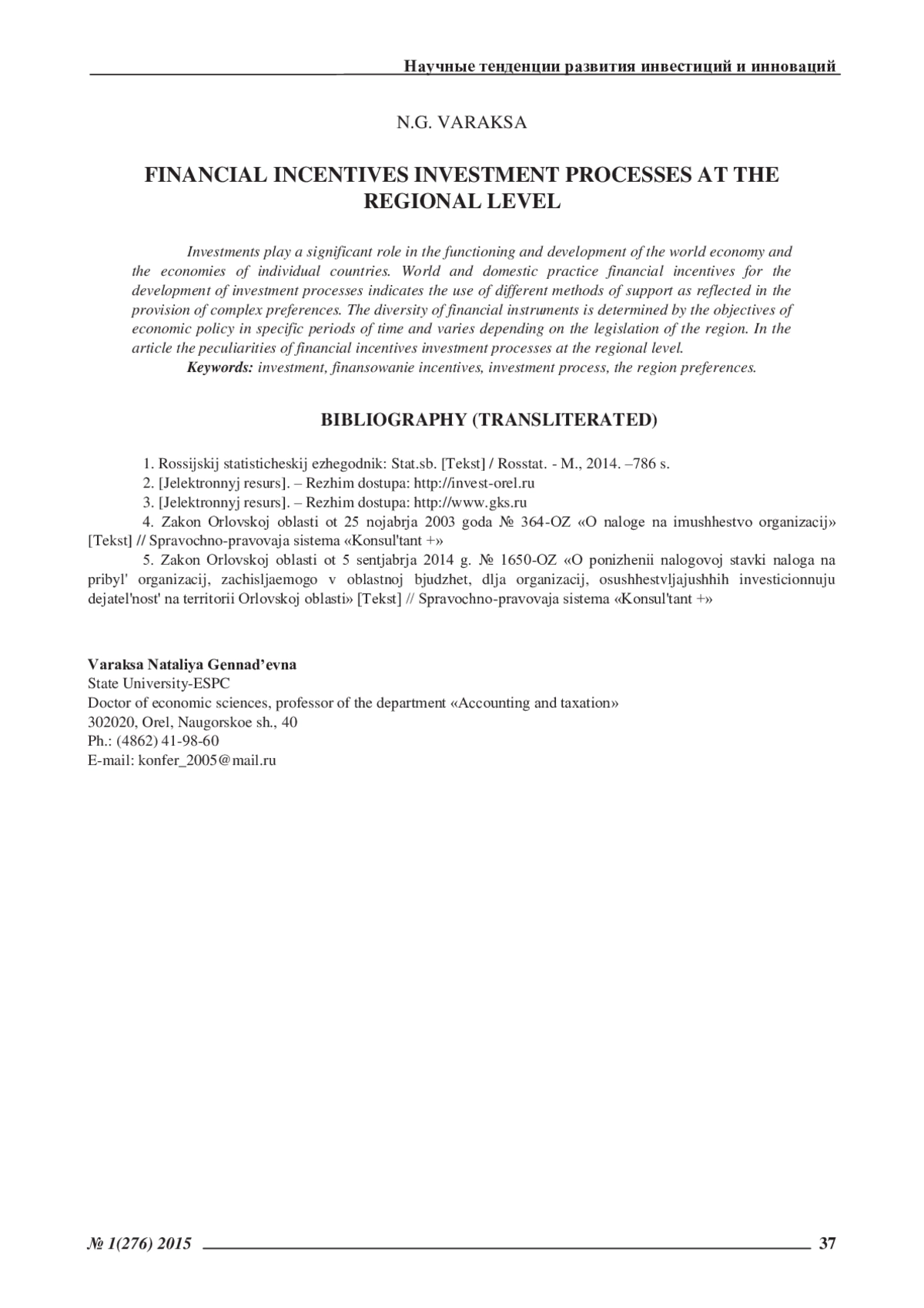 Статья: ФИНАНСОВОЕ СТИМУЛИРОВАНИЕ ИНВЕСТИЦИОННЫХ ПРОЦЕССОВ НА РЕГИОНАЛЬНОМ УРОВНЕ (2015)