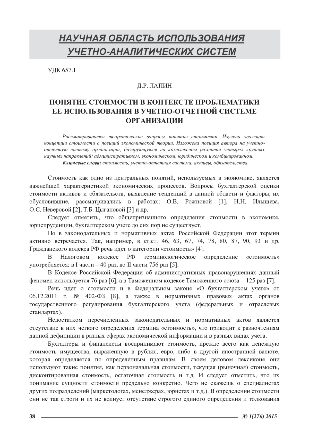 Рассматриваются теоретические вопросы понятия стоимости. Изучена эволюция концепции стоимости с позиций экономической теории. Изложена позиция автора на учетноотчетную систему организации, базирующуюся на комплексном развитии четырех крупных научных направлений: административном, экономическом, юридическом и комбинированном