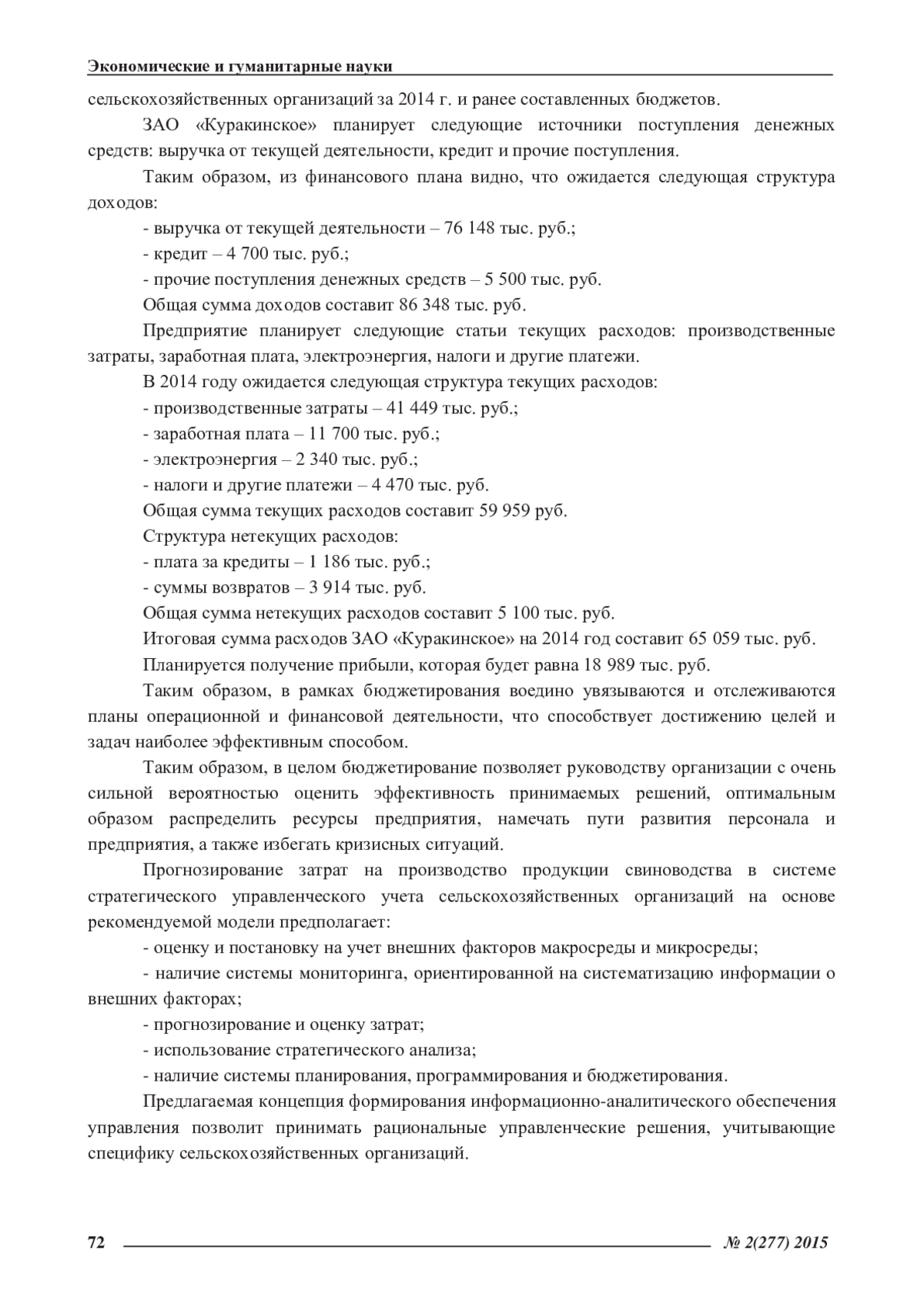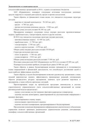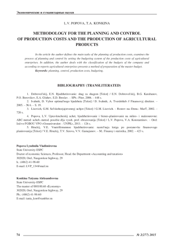 Статья: МЕТОДОЛОГИЯ ПЛАНИРОВАНИЯ И КОНТРОЛЯ ЗАТРАТ НА ПРОИЗВОДСТВО И ВЫПУСК СЕЛЬСКОХОЗЯЙСТВЕННОЙ ПРОДУКЦИИ (2015)