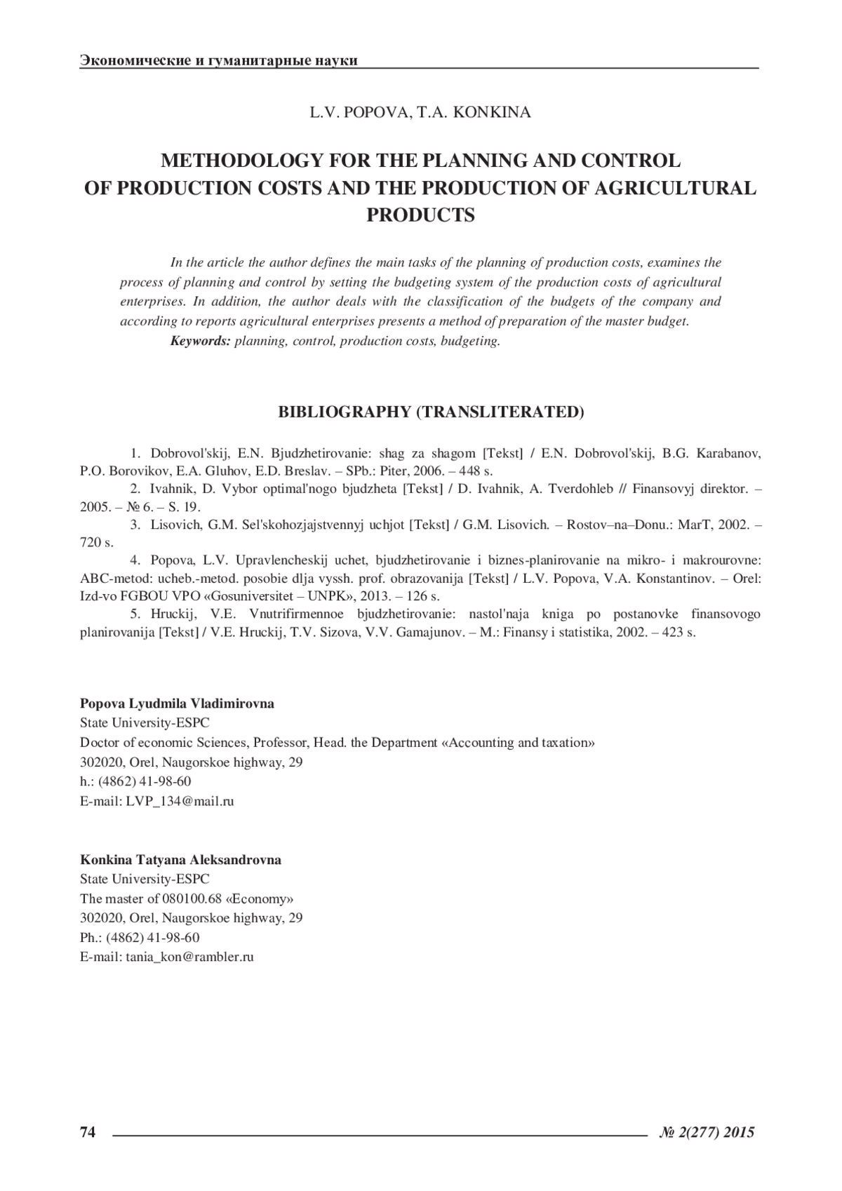 ПОПОВА Л. В., СОРОКОЛЕТОВА Т. А. МЕТОДОЛОГИЯ ПЛАНИРОВАНИЯ И КОНТРОЛЯ ЗАТРАТ НА ПРОИЗВОДСТВО И ВЫПУСК СЕЛЬСКОХОЗЯЙСТВЕННОЙ ПРОДУКЦИИ // ЭКОНОМИЧЕСКИЕ И ГУМАНИТАРНЫЕ НАУКИ. 2015. № 2 (277)