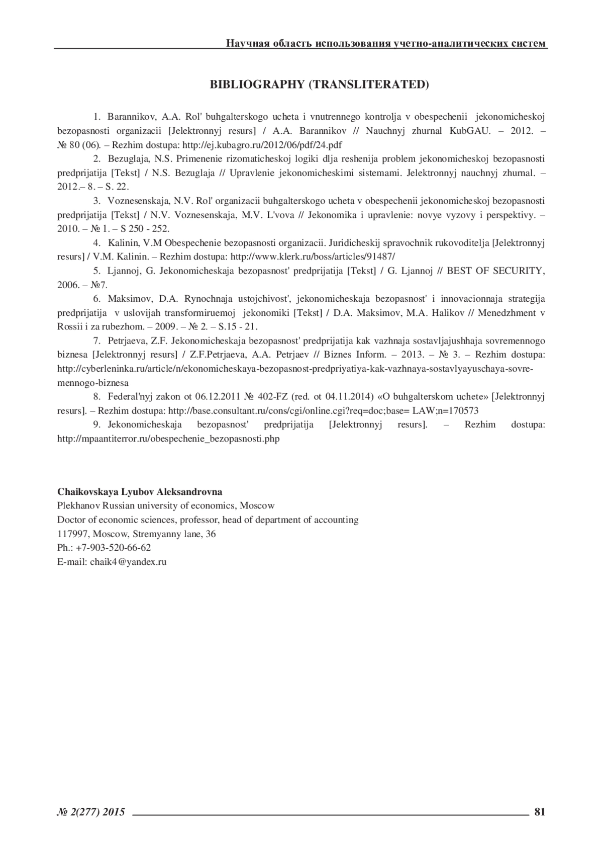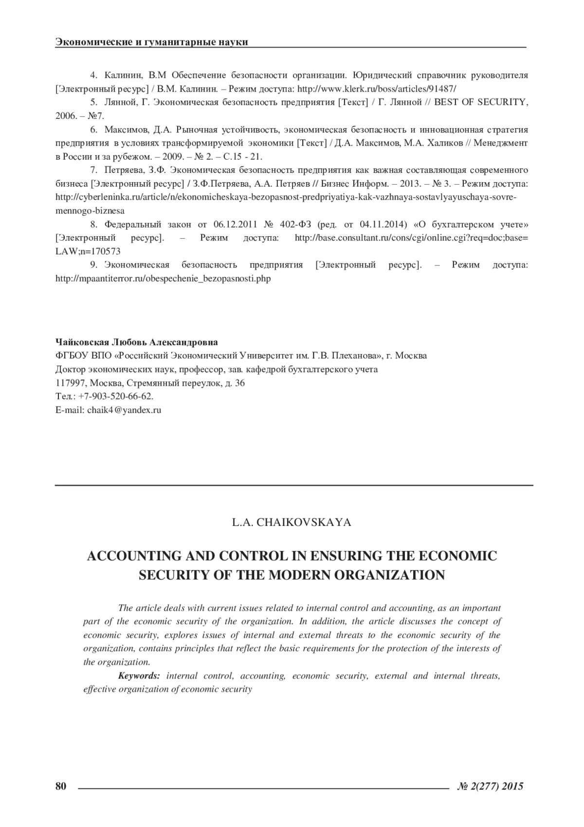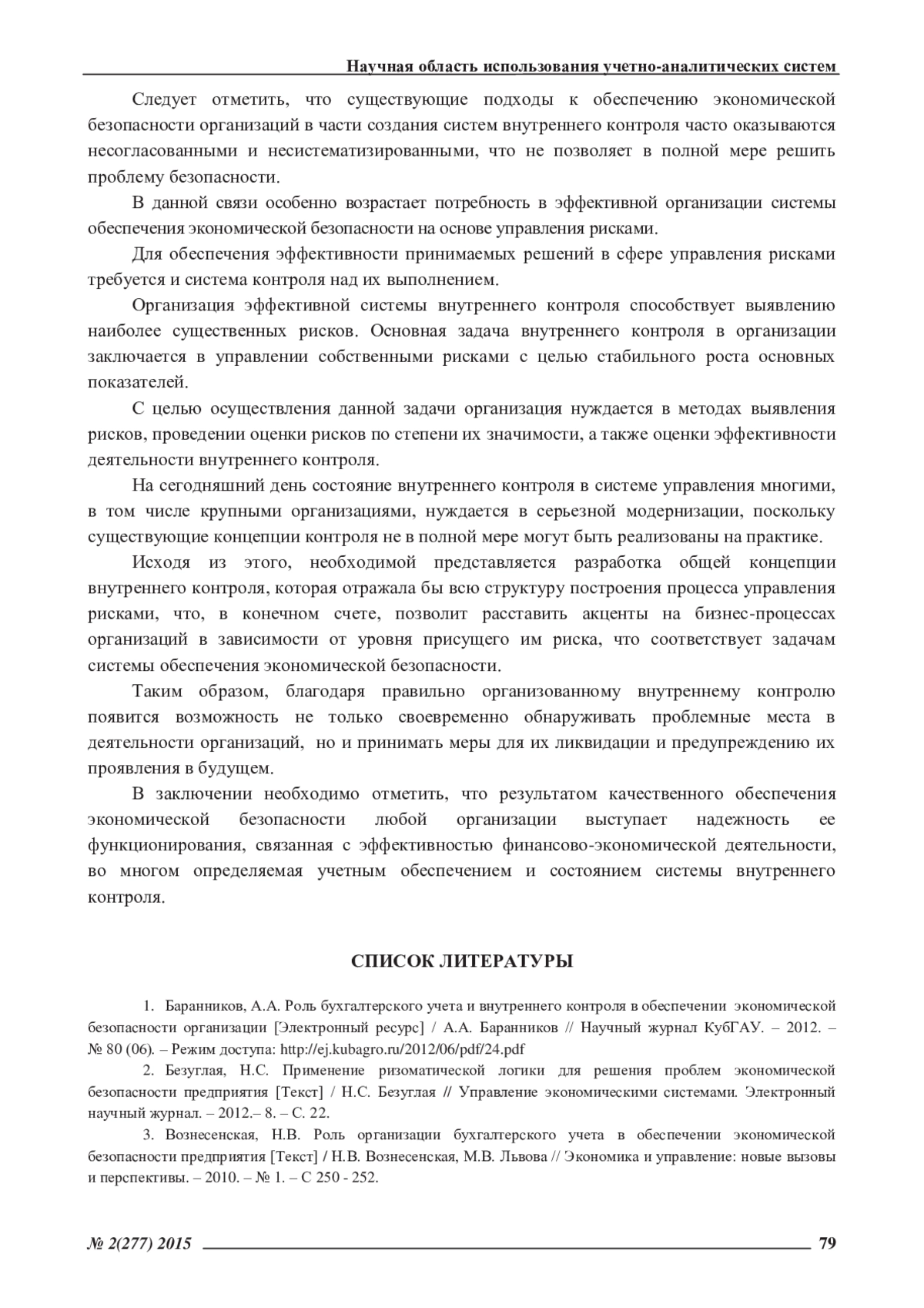 1. Баранников, А.А. Роль бухгалтерского учета и внутреннего контроля в обеспечении экономической безопасности организации /А.А. Баранников//Научный журнал КубГАУ. -2012. -№ 80 (06). -Режим доступа: http://ej.kubagro.ru/2012/06/pdf/24.pdf. EDN: PBUVPH