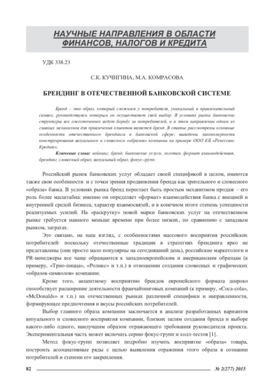 Бренд – это образ, который сложился у потребителя, уникальный и привлекательный символ, руководствуясь которым он осуществляет свой выбор. В условиях рынка банковские структуры все ожесточеннее ведут борьбу за потребителей, и в этом направлении одним из главных механизмов для привлечения клиентов является бренд. В статье рассмотрены основные особенности отечественного брендинга в банковской сфере, выведены закономерности конструирования визуального и словесного «образов» компании на примере ООО КБ «Ренессанс Кредит»