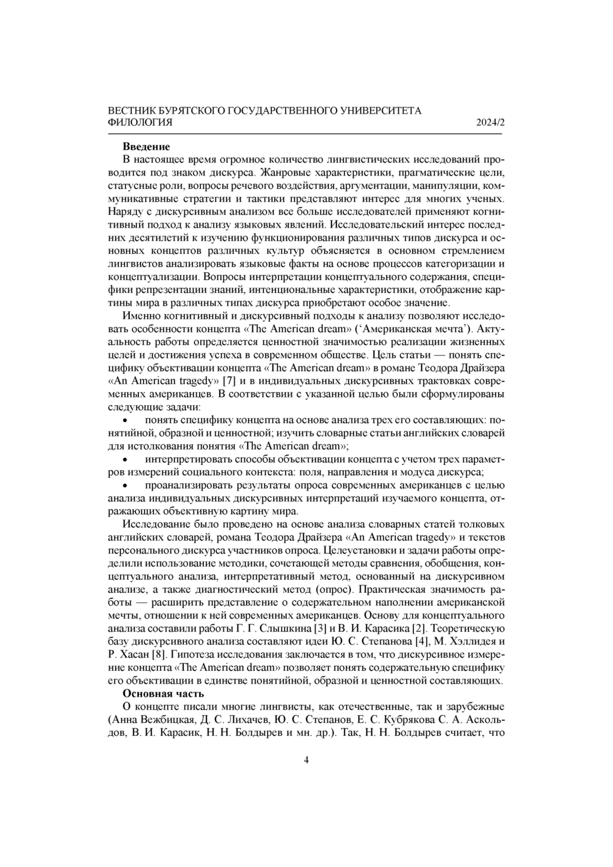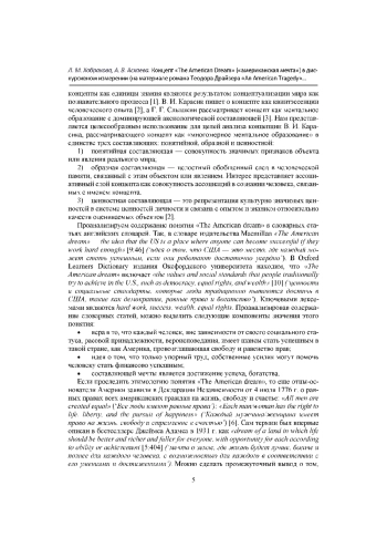 Статья представляет собой опыт дискурсивной интерпретации концепта «The American dream» на материале романа выдающегося писателя Теодора Драйзера «An American tragedy», в котором отражена иллюзорность мечтаний в поисках лучшей жизни в американском обществе первой половины XX века, а также представлений современных американцев. Основная цель работы - понять специфику объективации этого концепта. Актуальный характер исследования определяется значимостью достижения жизненных целей и успеха в современном прагматичном обществе. Основной интерпретативный метод на основе дискурсивного анализа, а также диагностический метод (опрос) используются для анализа концепта. Авторы описывают данный концепт в единстве его понятийной, образной и ценностной составляющих, анализируют его содержательное наполнение в романе, а также в текстах персонального дискурса на основе опроса американских граждан. В работе обращается внимание на неоднозначность трактовок современными американцами этого концепта ввиду объективных реалий меняющегося мира. Авторы приходят к выводу о том, что рассматриваемый концепт - сугубо национальный феномен, отражающий менталитет, культурно-специфические особенности американцев.