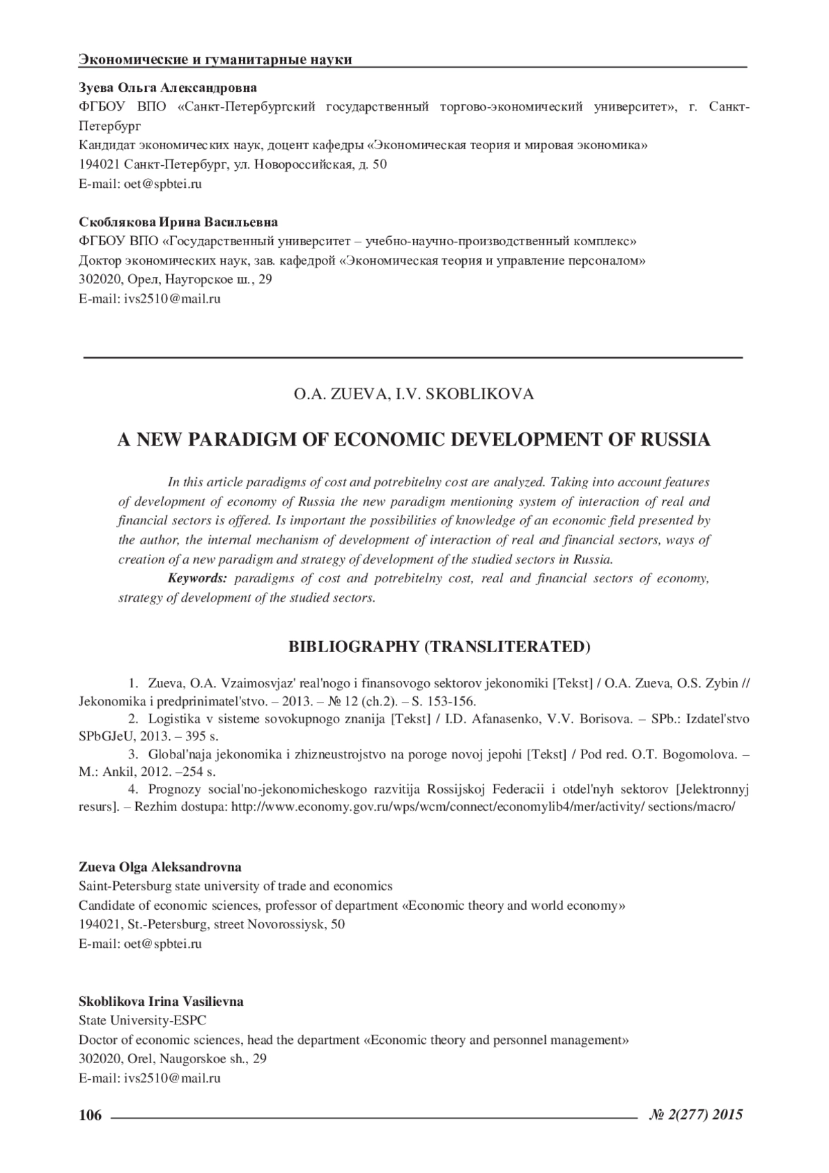 ЗУЕВА О. А., СКОБЛЯКОВА И. В. НОВАЯ ПАРАДИГМА ЭКОНОМИЧЕСКОГО РАЗВИТИЯ РОССИИ // ЭКОНОМИЧЕСКИЕ И ГУМАНИТАРНЫЕ НАУКИ. 2015. № 2 (277)