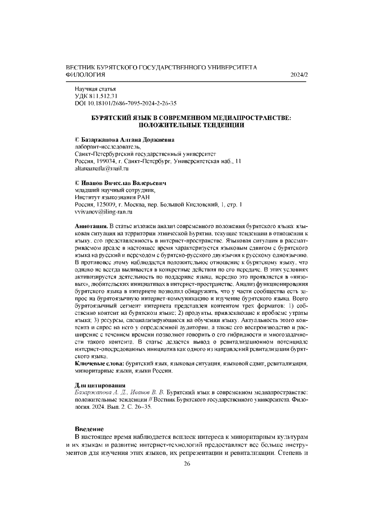 4. Иванов В. В., Харитонов В. С. Бурятский язык // Итоговые документы Научного центра по сохранению, возрождению и документации языков России / ИЯ РАН. 2021. С. 137-142. URL: https://iling-ran.ru/languages_of_russia/2021_stage1/doc2.pdf (дата обращения: 31.01.2024). Текст: электронный.