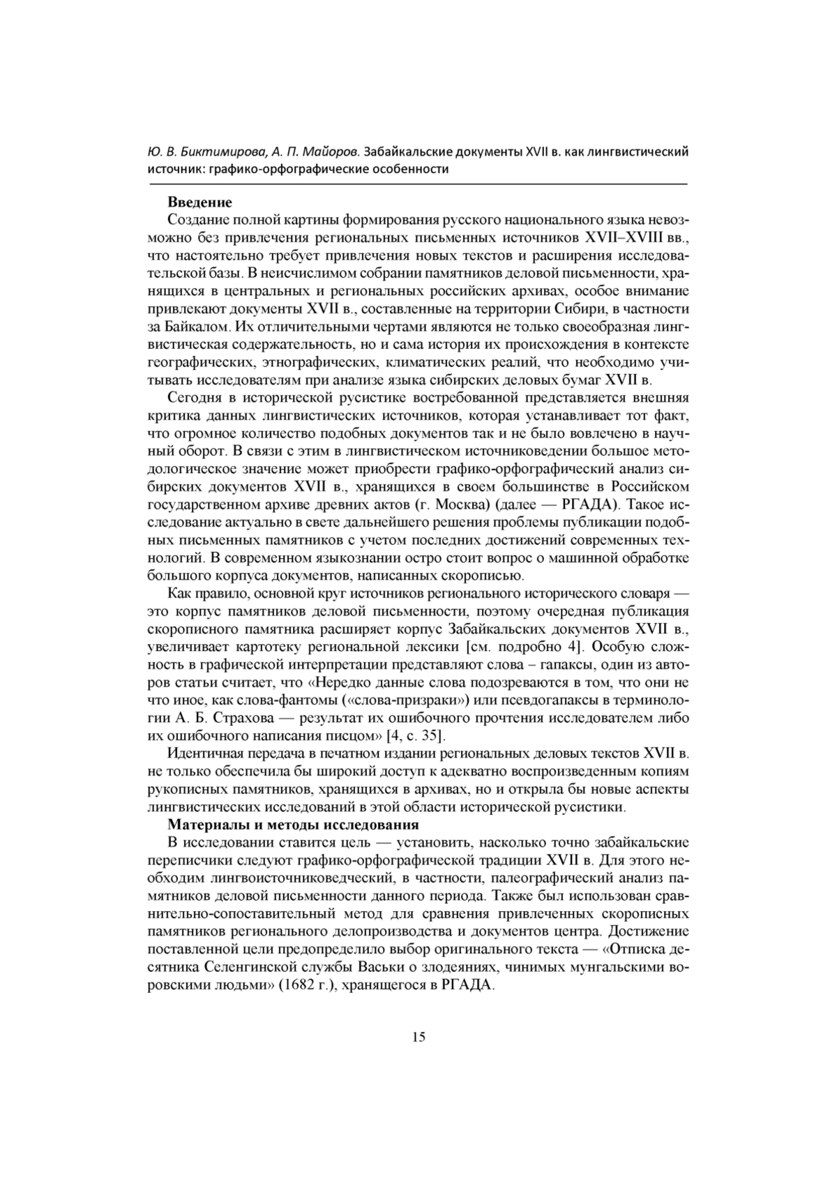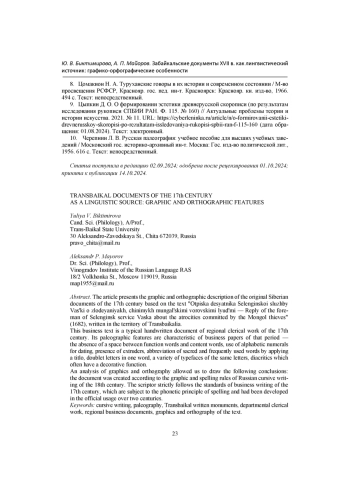 Создание полной картины формирования русского национального языка невозможно без привлечения региональных письменных источников XVII-XVIII вв., что настоятельно требует привлечения новых текстов и расширения исследовательской базы. В неисчислимом собрании памятников деловой письменности, хранящихся в центральных и региональных российских архивах, особое внимание привлекают документы XVII в., составленные на территории Сибири, в частности за Байкалом. Их отличительными чертами являются не только своеобразная лингвистическая содержательность, но и сама история их происхождения в контексте географических, этнографических, климатических реалий, что необходимо учитывать исследователям при анализе языка сибирских деловых бумаг XVII в