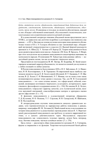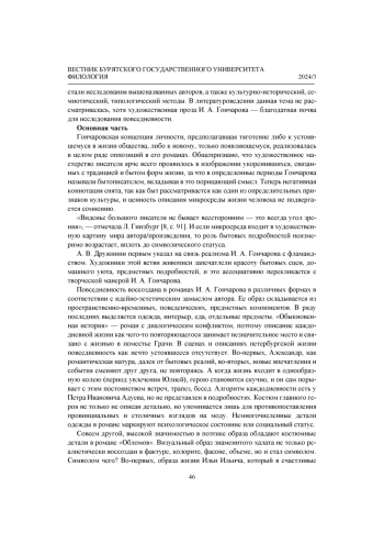 Автор ставит целью рассмотреть образ повседневности в художественном мире И. А. Гончарова. Феномен повседневности рассматривается как часть оппозиций: «быт - бытие», «вещное - духовное» и др. Анализу предшествует краткий экскурс в историю научного исследования этого феномена представителями философии, социологии, литературоведения, что позволяет констатировать широту диапазона различных подходов и отсутствие универсальной формулировки понятия. В работе использовались культурно-исторический, семиотический, типологический методы. Результатом исследования стали следующие выводы. В романах И. А. Гончарова образ повседневности представлен прежде всего бытовыми, а также пространственно-временными реалиями. Поэтика повседневности является базовым компонентом создания образов в художественном мире И. А. Гончарова. Образ повседневности в романах писателя обладает самодостаточностью, культурно-исторической и эстетической ценностью, его структурные элементы служат задачам создания образов героев, психологизации повествования, установлению идейно-эстетического замысла автора.