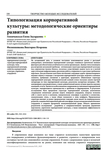 Статья: ТИПОЛОГИЗАЦИЯ КОРПОРАТИВНОЙ КУЛЬТУРЫ: МЕТОДОЛОГИЧЕСКИЕ ОРИЕНТИРЫ РАЗВИТИЯ (2025)