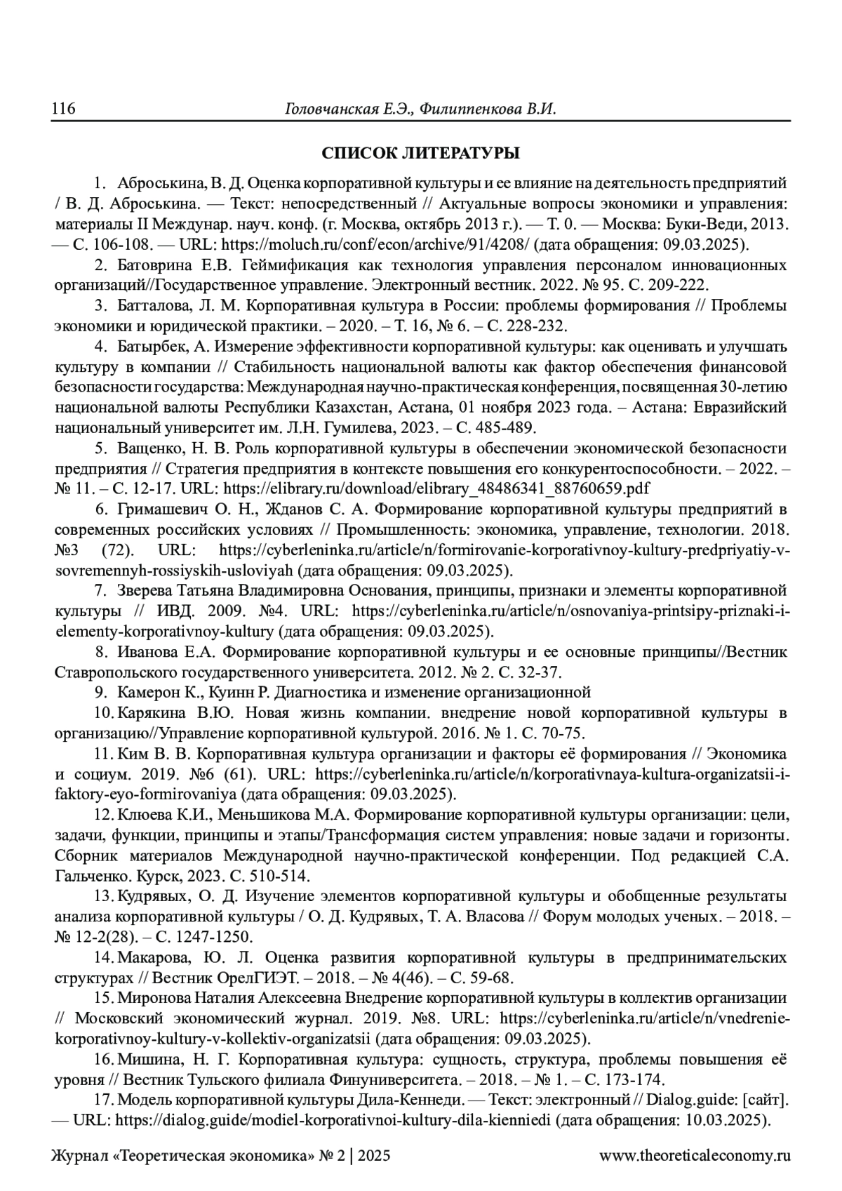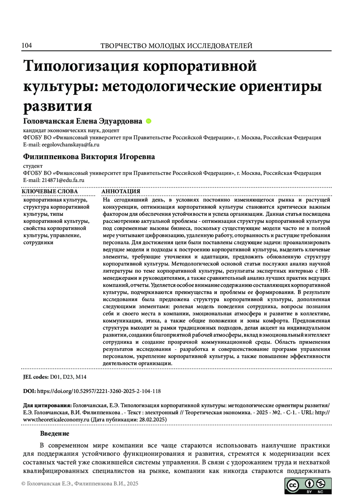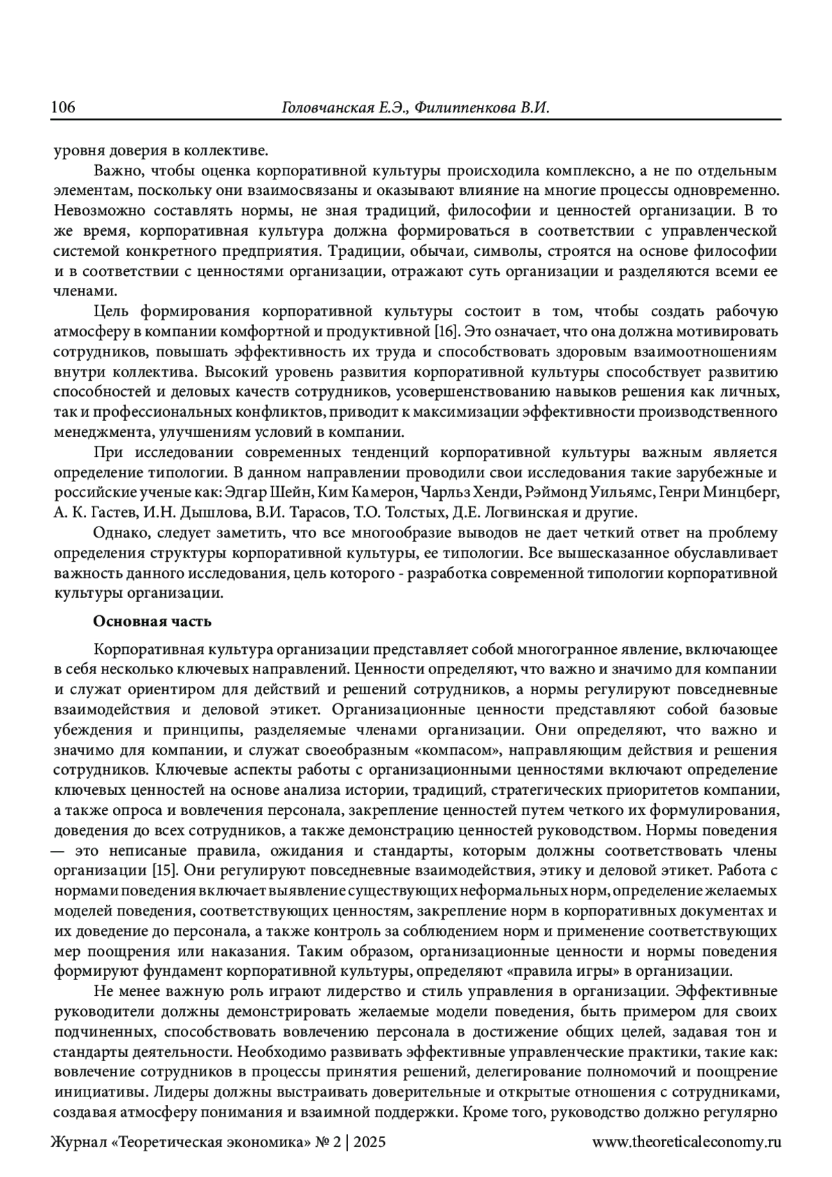 ФИЛИППЕНКОВ А. В., ГОЛОВЧАНСКАЯ Е. Э. ТИПОЛОГИЗАЦИЯ КОРПОРАТИВНОЙ КУЛЬТУРЫ: МЕТОДОЛОГИЧЕСКИЕ ОРИЕНТИРЫ РАЗВИТИЯ // ТЕОРЕТИЧЕСКАЯ ЭКОНОМИКА. 2025. № 2 (122)