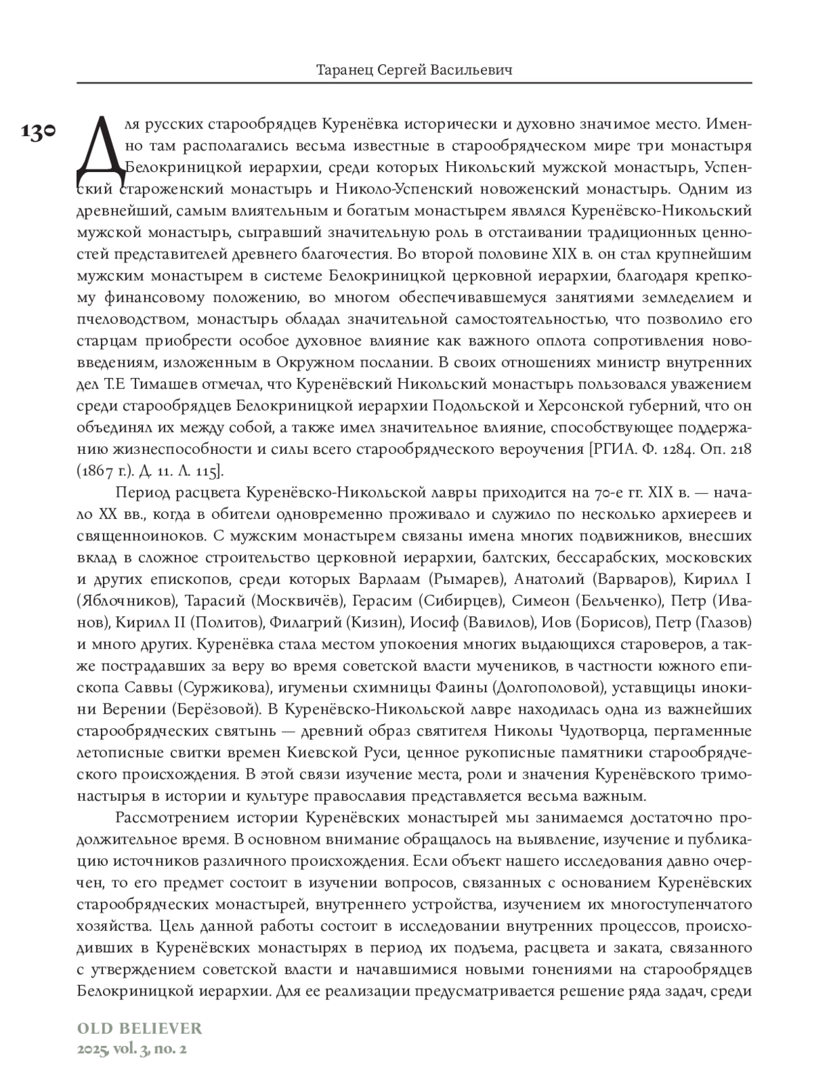 Для русских старообрядцев Куренёвка исторически и духовно значимое место. Именно там располагались весьма известные в старообрядческом мире три монастыря Белокриницкой иерархии, среди которых Никольский мужской монастырь, Успенский староженский монастырь и Николо-Успенский новоженский монастырь. Одним из древнейший, самым влиятельным и богатым монастырем являлся Куренёвско-Никольский мужской монастырь, сыгравший значительную роль в отстаивании традиционных ценностей представителей древнего благочестия. Во второй половине ХIХ в. он стал крупнейшим мужским монастырем в системе Белокриницкой церковной иерархии, благодаря крепкому финансовому положению, во многом обеспечивавшемуся занятиями земледелием и пчеловодством, монастырь обладал значительной самостоятельностью, что позволило его старцам приобрести особое духовное влияние как важного оплота сопротивления нововведениям, изложенным в Окружном послании. В своих отношениях министр внутренних дел Т. Е Тимашев отмечал, что Куренёвский Никольский монастырь пользовался уважением среди старообрядцев Белокриницкой иерархии Подольской и Херсонской губерний, что он объединял их между собой, а также имел значительное влияние, способствующее поддержанию жизнеспособности и силы всего старообрядческого вероучения [РГИА. Ф. 1284. Оп. 218 (1867 г.). Д. 11. Л. 115].