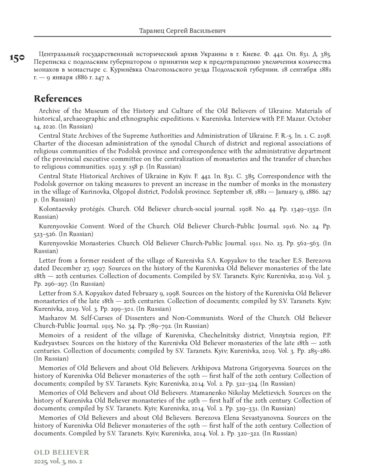 21. Письмо С.А. Копякова от 9 февраля 1998 г. // Источники по истории Куренёвских старообрядческих монастырей конца ХVIII-ХХ вв. / Сборник документов; сост. С.В. Таранец. Киев; Куренёвка, 2019. Т. 3. С. 299-301.
