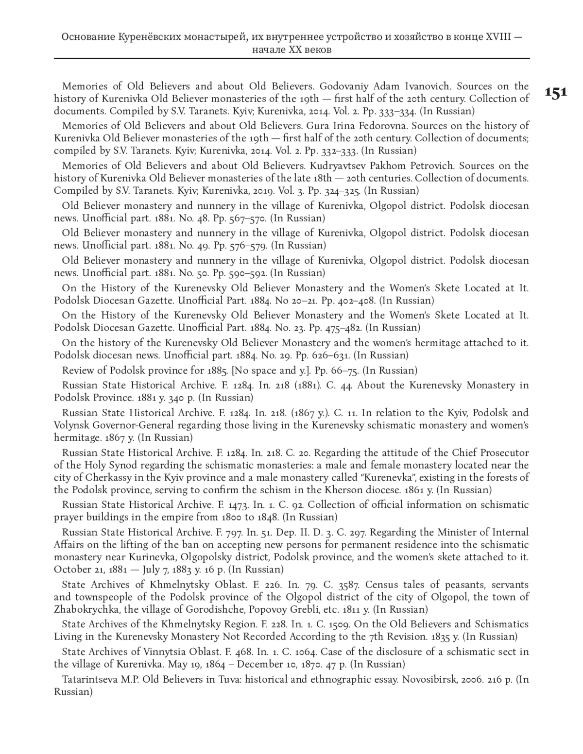 13. К истории Куренёвского старообрядческого монастыря и состоящего при нем женского скита // Подольские епархиальные ведомости. Часть неофициальная. 1884. № 23. С. 475-482.