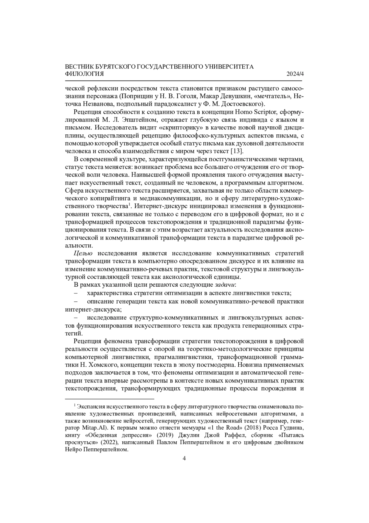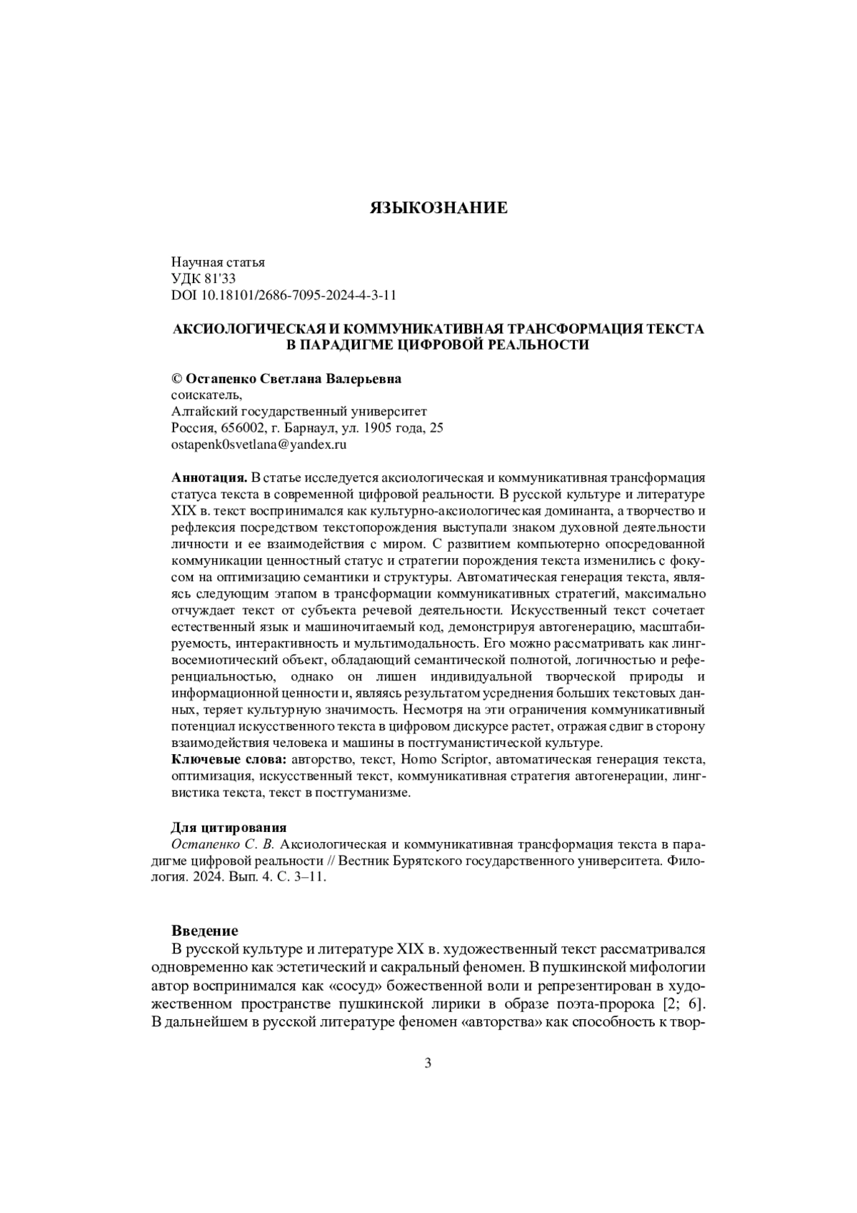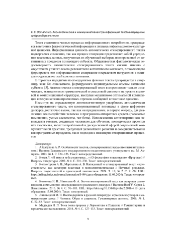 В статье исследуется аксиологическая и коммуникативная трансформация статуса текста в современной цифровой реальности. В русской культуре и литературе XIX в. текст воспринимался как культурно-аксиологическая доминанта, а творчество и рефлексия посредством текстопорождения выступали знаком духовной деятельности личности и ее взаимодействия с миром. С развитием компьютерно опосредованной коммуникации ценностный статус и стратегии порождения текста изменились с фокусом на оптимизацию семантики и структуры. Автоматическая генерация текста, являясь следующим этапом в трансформации коммуникативных стратегий, максимально отчуждает текст от субъекта речевой деятельности. Искусственный текст сочетает естественный язык и машиночитаемый код, демонстрируя автогенерацию, масштабируемость, интерактивность и мультимодальность. Его можно рассматривать как лингвосемиотический объект, обладающий семантической полнотой, логичностью и референциальностью, однако он лишен индивидуальной творческой природы и информационной ценности и, являясь результатом усреднения больших текстовых данных, теряет культурную значимость. Несмотря на эти ограничения коммуникативный потенциал искусственного текста в цифровом дискурсе растет, отражая сдвиг в сторону взаимодействия человека и машины в постгуманистической культуре.