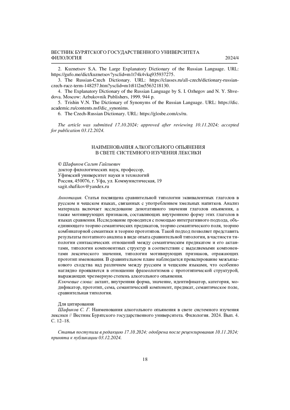 10. Shafikov S. G. The Semantic Field and Componential Meaning of French Lexical Units for Inebriation // Foreign Languages in the Professional Sphere: Pedagogics, Linguistics, Crosscultural Communication [Inostranniy yazik v professionalnoi sfere: pedagogika, lingvistika, mezhkulturnaya kommunikatsiya]. Moscow, 2022. Part 2. P. 231-239.