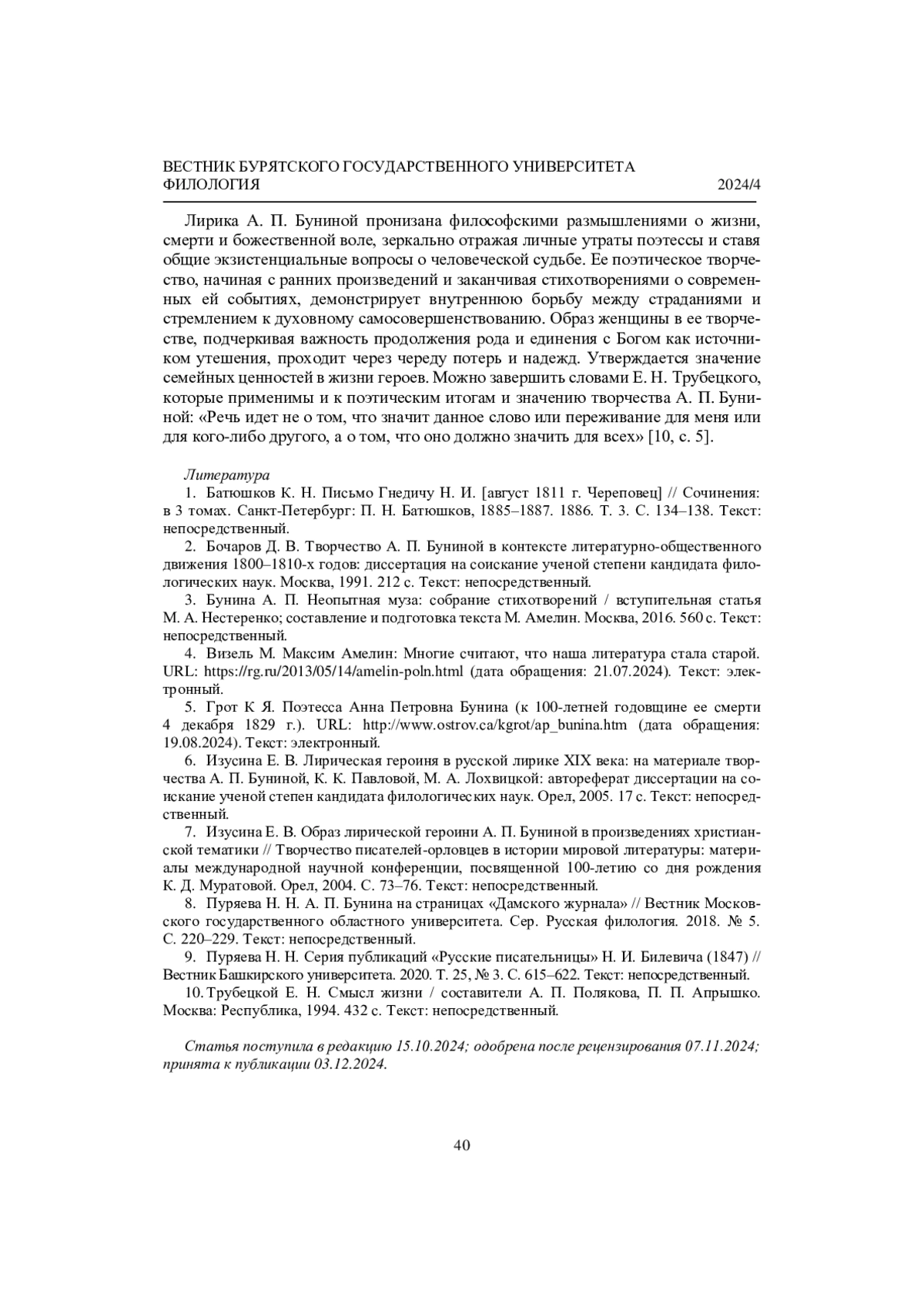 8. Пуряева Н. Н. А. П. Бунина на страницах “Дамского журнала” // Вестник Московского государственного областного университета. Сер. Русская филология. 2018. № 5. С. 220-229. Текст: непосредственный. EDN: YSQDRJ