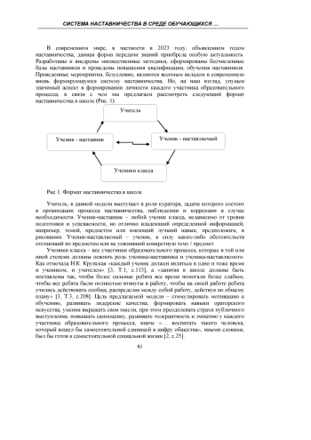 В статье предлагается модель реализации наставничества в среде обучающихся. В современном педагогическом пространстве актуализация системы наставничества станет эффективным ресурсом для оптимизации образовательного процесса и решения ряда стратегических задач в системе образования и формирования личности молодого поколения.