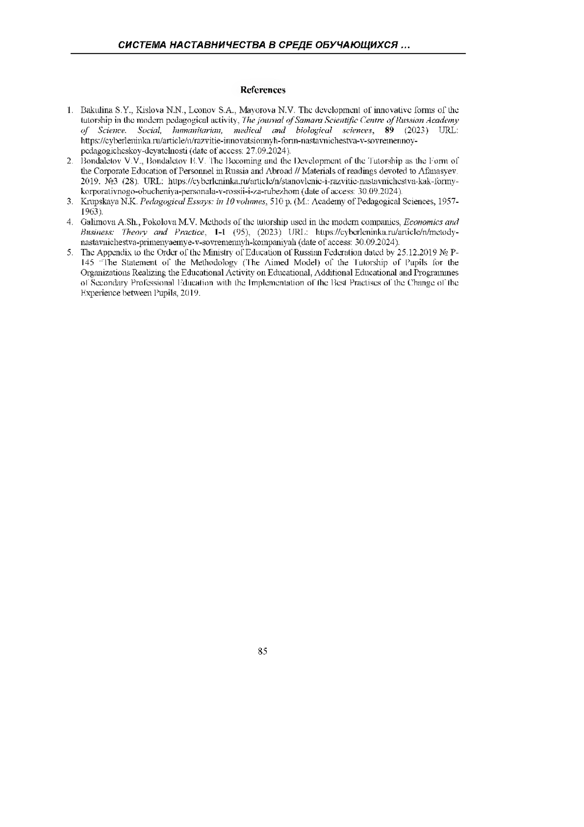 4. Галимова А.Ш., Поколова М.В. Методы наставничества, применяемые в современных компаниях / А.Ш. Галимова, М.В. Поколова // Экономика и бизнес: теория и практика. - 2023. - №1-1 (95). URL: https://cyberleninka.ru/article/n/metody-nastavnichestva-primenyaemye-v-sovremennyh-kompaniyah (дата обращения: 30.09.2024). EDN: TSKCHY
