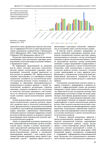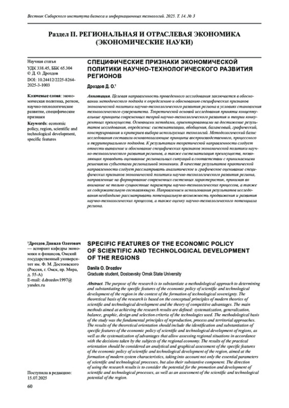 Целевая направленность проведенного исследования заключается в обосновании методического подхода к определению и обоснованию специфических признаков экономической политики научно-технологического развития региона в условиях становления технологического суверенитета. Теоретической основой исследования приняты концептуальные принципы современных теорий научно-технологического развития и теории конкурентных преимуществ. Основными методами, ориентированными на достижение результатов исследования, определены: систематизации, обобщения, балансовый, графический, конструирования и критериев выбора используемых технологий. Методологический базис исследования составили основополагающие принципы воспроизводственного, процессного и территориального подходов. К результатам теоретической направленности следует отнести выявление и обоснование специфических признаков экономической политики научно-технологического развития регионов, а также систематизация преимуществ, позволяющих проводить оценивание региональных ситуаций в соответствии с принимаемыми решениями субъектами региональной экономики. В качестве результатов практической направленности следует рассматривать аналитическое и графическое оценивание специфических признаков экономической политики научно-технологического развития региона, направленные на формирование современных системных характеристик, принимая во внимание не только сущностные параметры научно-технологических процессов, а также их содержательную составляющую. Направлением использования результатов исследования необходимо рассматривать потенциальную возможность продвижения и развития научно-технологических процессов, а также оценку научно-технологического потенциала региона.