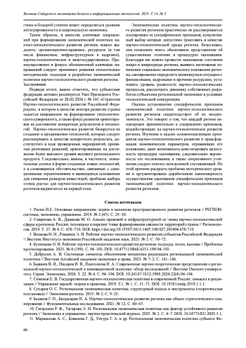 2. Смирнова А. В., Дашкова М. О. Анализ правовой и инфраструктурной ос¬новы научно-технологической сферы в регионах России: потенциал и перспективы формирования связности территорий страны // Регионология. 2019. Т. 27. № 4. С. 678-710. https://doi.org/10.15507/2413-1407.109.027.201904.678-710.