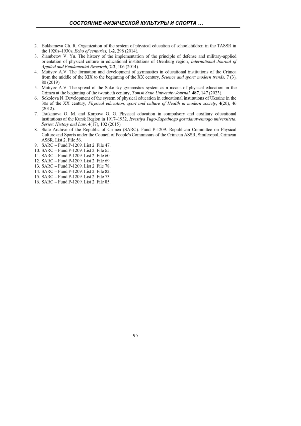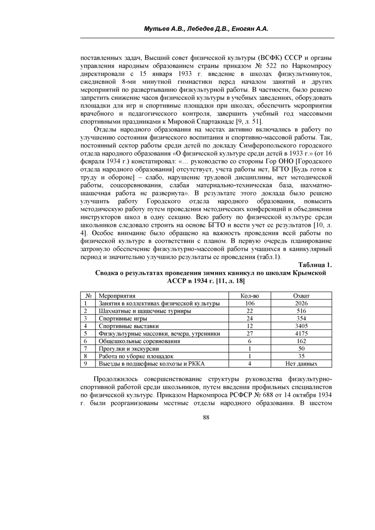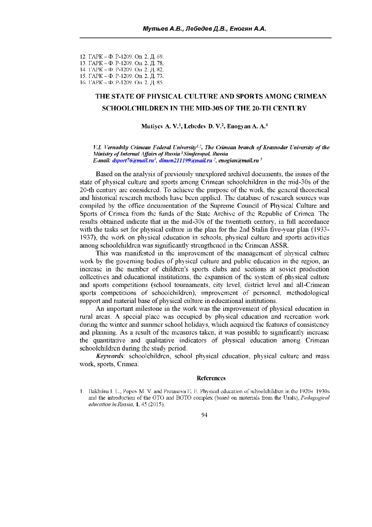 На основе анализа архивных документов, рассматривается состояние физического воспитания, физкультурно-массовой и спортивной работы среди школьников Крыма в середине 1930-х гг. Установлено, что в исследуемый период была значительно усилена работа по физическому воспитанию в школах, физкультурно-массовая и спортивная деятельность среди школьников полуострова. Совершенствовалось руководство физкультурной работой, увеличивалось количество детских спортивных кружков и секций, расширялась система физкультурно-спортивных соревнований, улучшалось кадровое и методическое обеспечение, а также материальная база физкультурной работы в учебных заведениях. Физкультурно-оздоровительная работа в период зимних и летних школьных каникул приобрела черты системности и плановости. В итоге предпринятых мер удалось значительно повысить количественные и качественные показатели физкультурной работы среди крымских школьников.