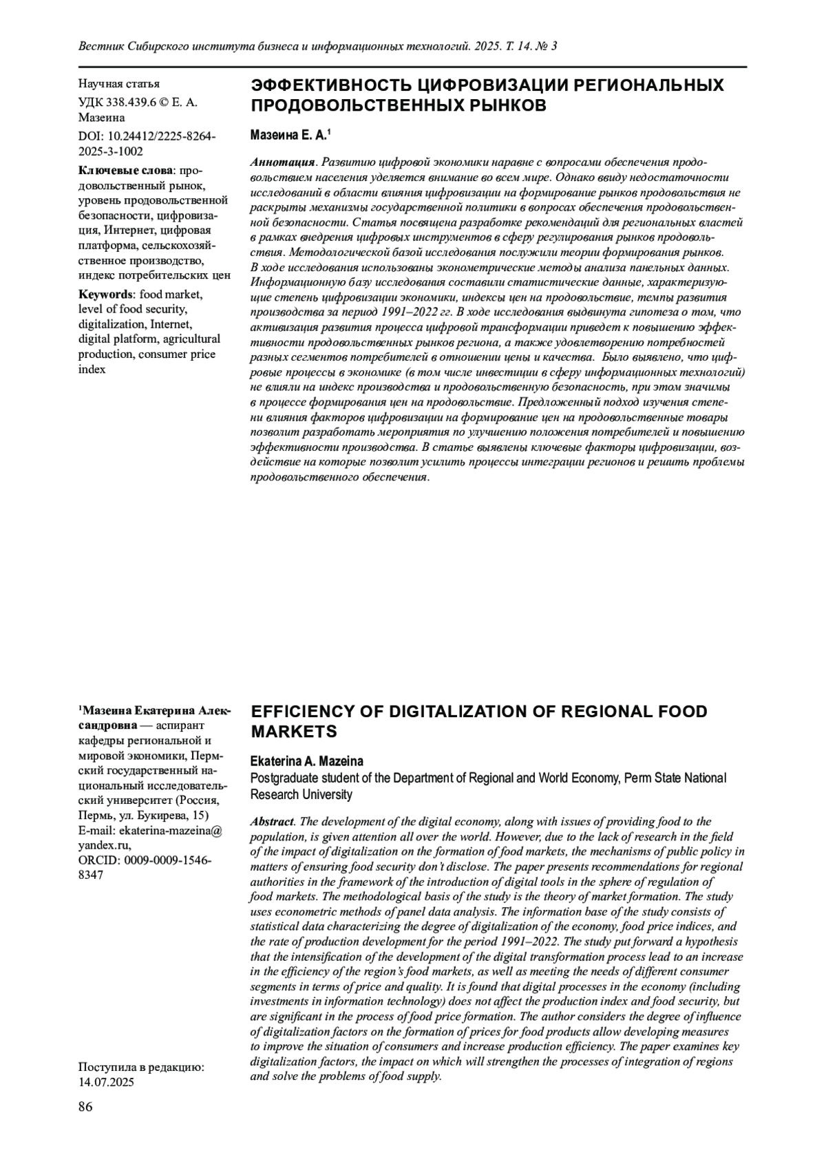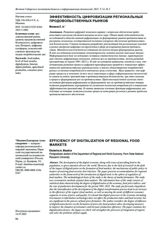 Развитию цифровой экономики наравне с вопросами обеспечения продовольствием населения уделяется внимание во всем мире. Однако ввиду недостаточности исследований в области влияния цифровизации на формирование рынков продовольствия не раскрыты механизмы государственной политики в вопросах обеспечения продовольственной безопасности. Статья посвящена разработке рекомендаций для региональных властей в рамках внедрения цифровых инструментов в сферу регулирования рынков продовольствия. Методологической базой исследования послужили теории формирования рынков. В ходе исследования использованы эконометрические методы анализа панельных данных. Информационную базу исследования составили статистические данные, характеризующие степень цифровизации экономики, индексы цен на продовольствие, темпы развития производства за период 1991–2022 гг. В ходе исследования выдвинута гипотеза о том, что активизация развития процесса цифровой трансформации приведет к повышению эффективности продовольственных рынков региона, а также удовлетворению потребностей разных сегментов потребителей в отношении цены и качества. Было выявлено, что цифровые процессы в экономике (в том числе инвестиции в сферу информационных технологий) не влияли на индекс производства и продовольственную безопасность, при этом значимы в процессе формирования цен на продовольствие. Предложенный подход изучения степени влияния факторов цифровизации на формирование цен на продовольственные товары позволит разработать мероприятия по улучшению положения потребителей и повышению эффективности производства. В статье выявлены ключевые факторы цифровизации, воздействие на которые позволит усилить процессы интеграции регионов и решить проблемы продовольственного обеспечения.