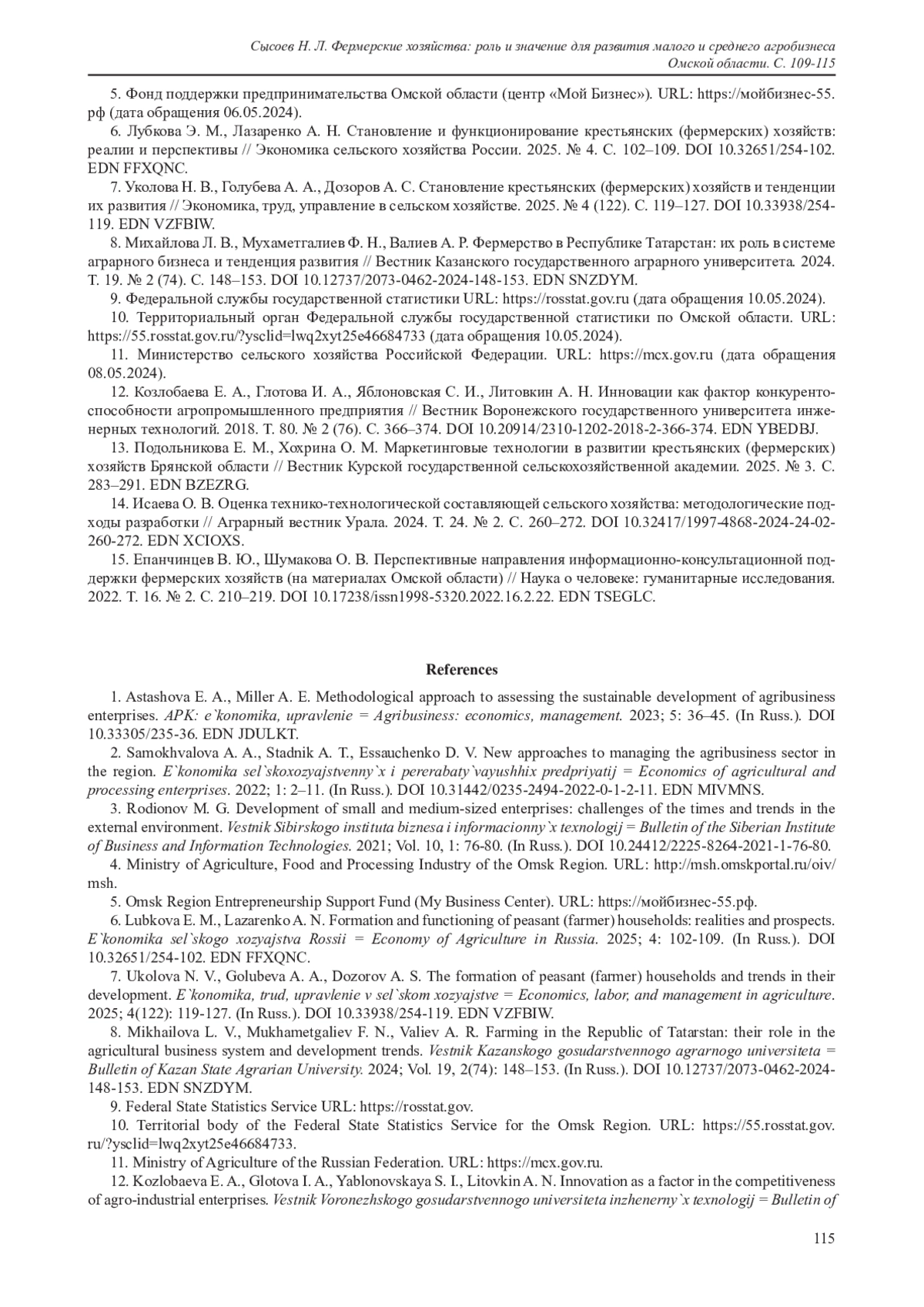 6. Лубкова Э. М., Лазаренко А. Н. Становление и функционирование крестьянских (фермерских) хозяйств: реалии и перспективы // Экономика сельского хозяйства России. 2025. № 4. С. 102-109. https://doi.org/10.32651/254-102. EDN FFXQNC.