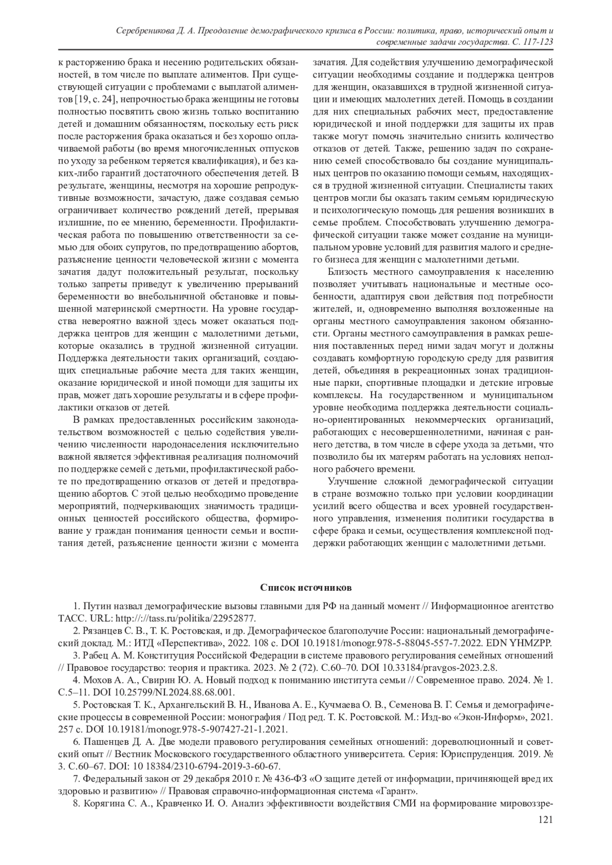СЕРЕБРЕННИКОВА Д. А. ПРЕОДОЛЕНИЕ ДЕМОГРАФИЧЕСКОГО КРИЗИСА В РОССИИ: ПОЛИТИКА, ПРАВО, ИСТОРИЧЕСКИЙ ОПЫТ И СОВРЕМЕННЫЕ ЗАДАЧИ ГОСУДАРСТВА // ВЕСТНИК СИБИРСКОГО ИНСТИТУТА БИЗНЕСА И ИНФОРМАЦИОННЫХ ТЕХНОЛОГИЙ. 2025. ТОМ 14, № 3