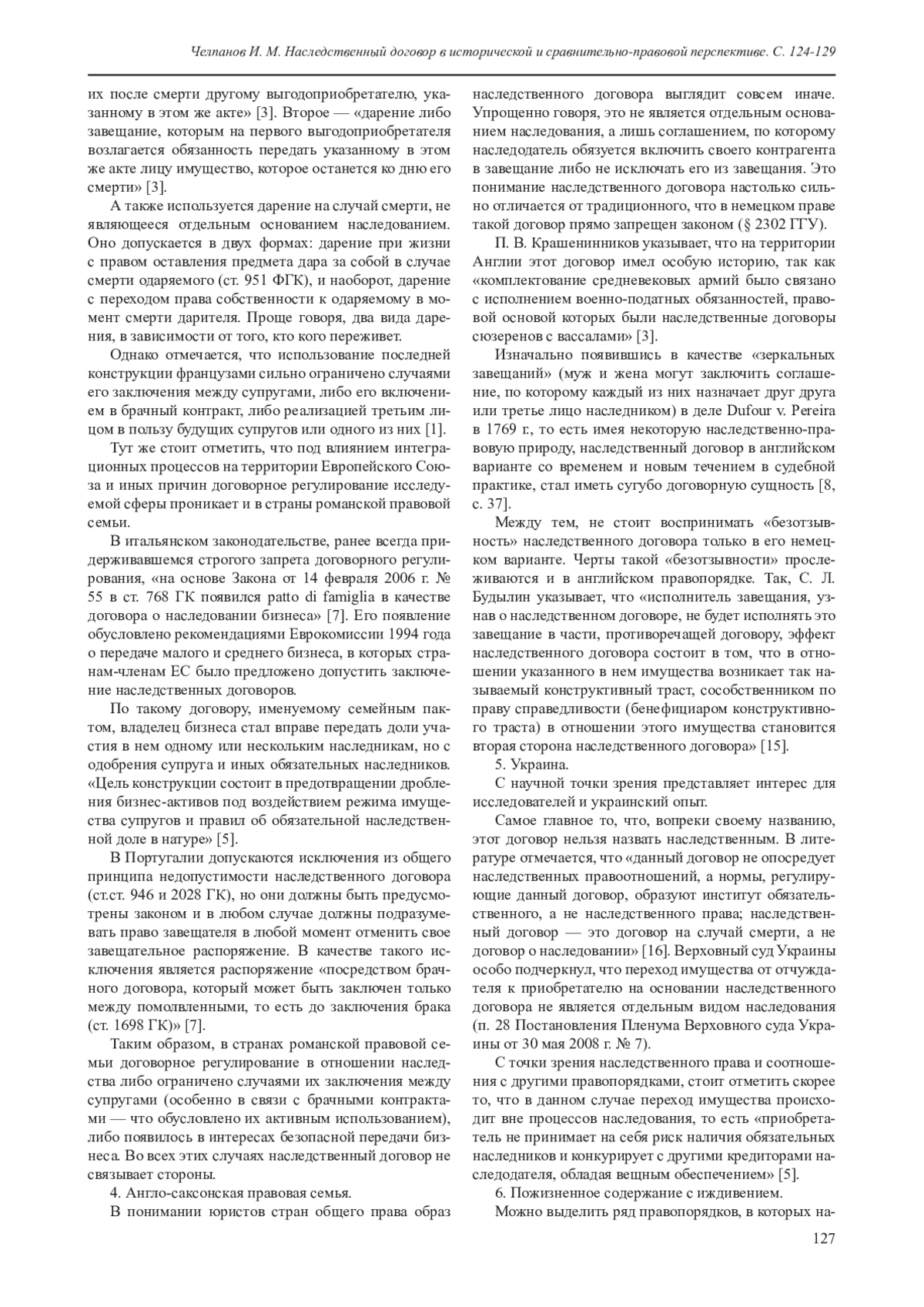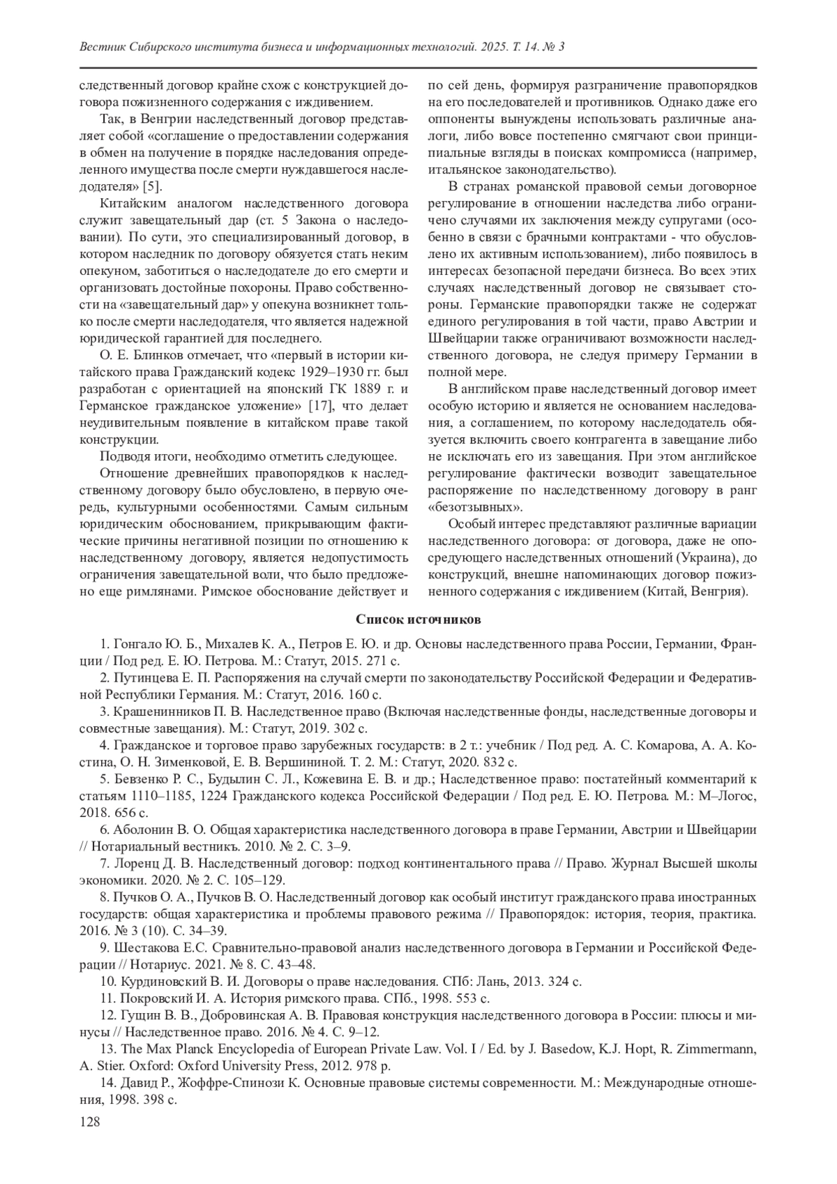 7. Лоренц Д. В. Наследственный договор: подход континентального права // Право. Журнал Высшей школы экономики. 2020. № 2. С. 105-129.