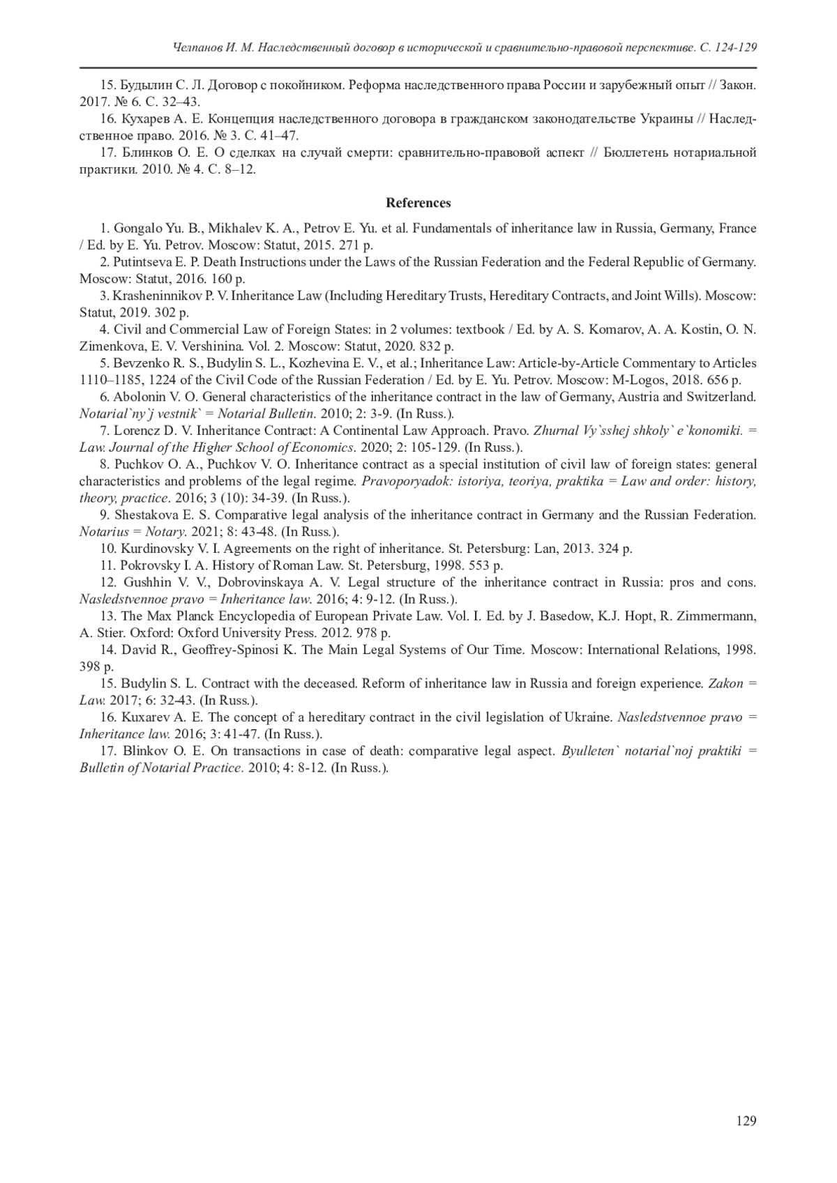 15. Будылин С. Л. Договор с покойником. Реформа наследственного права России и зарубежный опыт // Закон. 2017. № 6. С. 32-43.