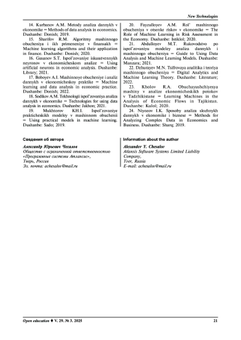 Материалы и методы: В данной работе использовались различные методы и подходы к изучению машинного обучения в сфере национальной экономики. Основные методы включают анализ научной литературы, статистический анализ данных, моделирование с использованием алгоритмов машинного обучения, а также практическую реализацию экономических моделей с применением языков программирования Python и библиотек машинного обучения. Для анализа экономических данных были выбраны методы линейной регрессии, деревьев решений и нейронных сетей, так как они позволяют эффективно прогнозировать изменения ключевых макроэкономических показателей, таких как ВВП, инфляция, курс валют и уровень безработицы. В качестве инструментов использовались библиотеки Pandas, NumPy, Scikitlearn и Matplotlib, позволяющие обрабатывать, анализировать и визуализировать данные. Исследование основано на данных официальных статистических агентств и финансовых учреждений, включая исторические данные о макроэкономических показателях, рыночных тенденциях и финансовых рисках. Для обработки данных использовались методы очистки, нормализации и преобразования данных, что позволило повысить точность моделей. Практическая часть исследования включала разработку алгоритмов машинного обучения для прогнозирования экономических показателей. Модель линейной регрессии использовалась для предсказания роста ВВП, а более сложные модели, такие как случайные леса и градиентный бустинг, применялись для анализа более сложных взаимосвязей в экономике. Таким образом, использование современных методов машинного обучения в экономике позволяет получать точные прогнозы, выявлять закономерности в экономических данных и принимать стратегические решения на основе объективного анализа.